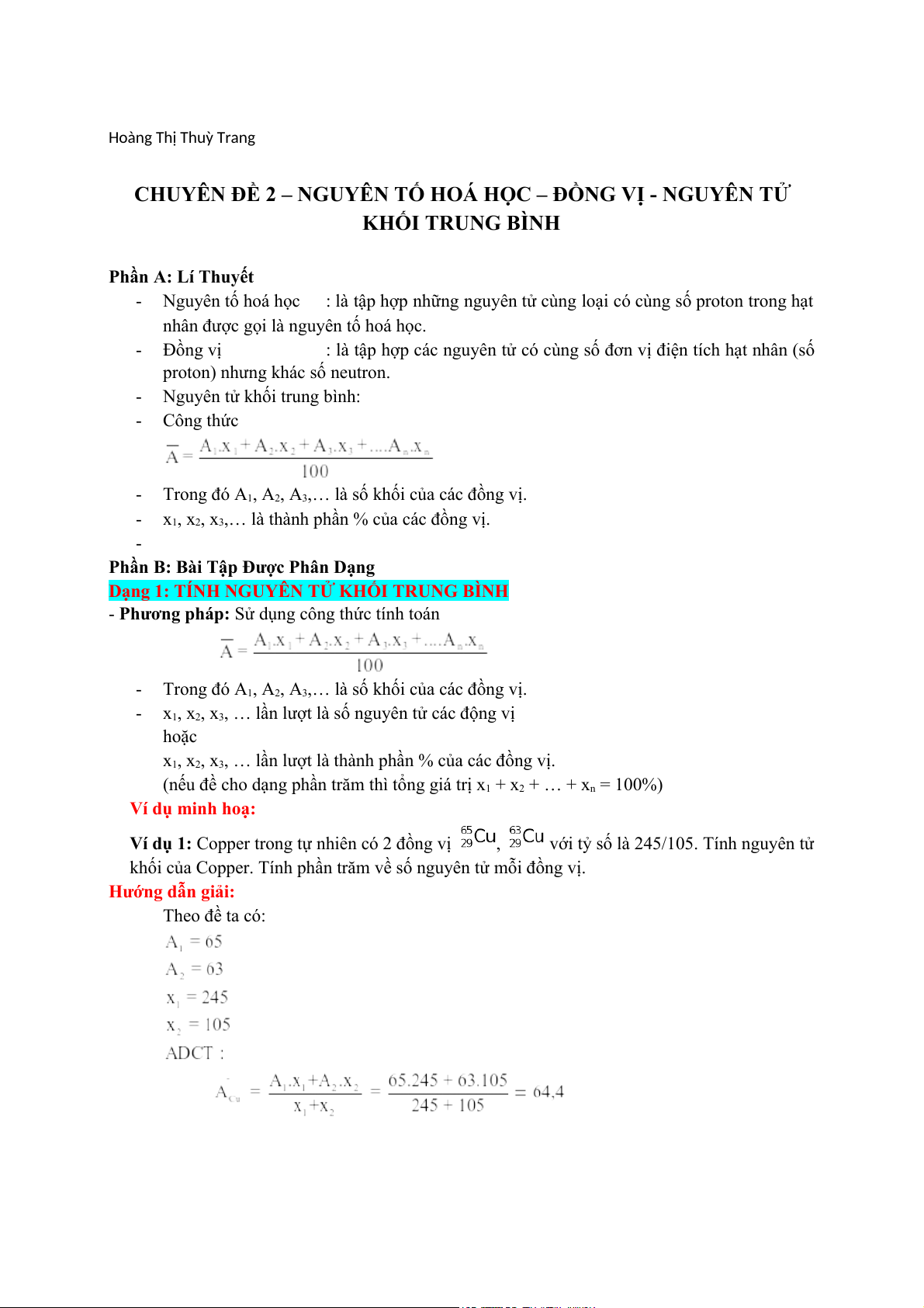 CHUYÊN ĐỀ 2 – NGUYÊN TỐ HOÁ HỌC – ĐỒNG VỊ - NGUYÊN TỬ KHỐI TRUNG BÌNH Phần A: Lí Thuyết - Nguyên tố hoá học
