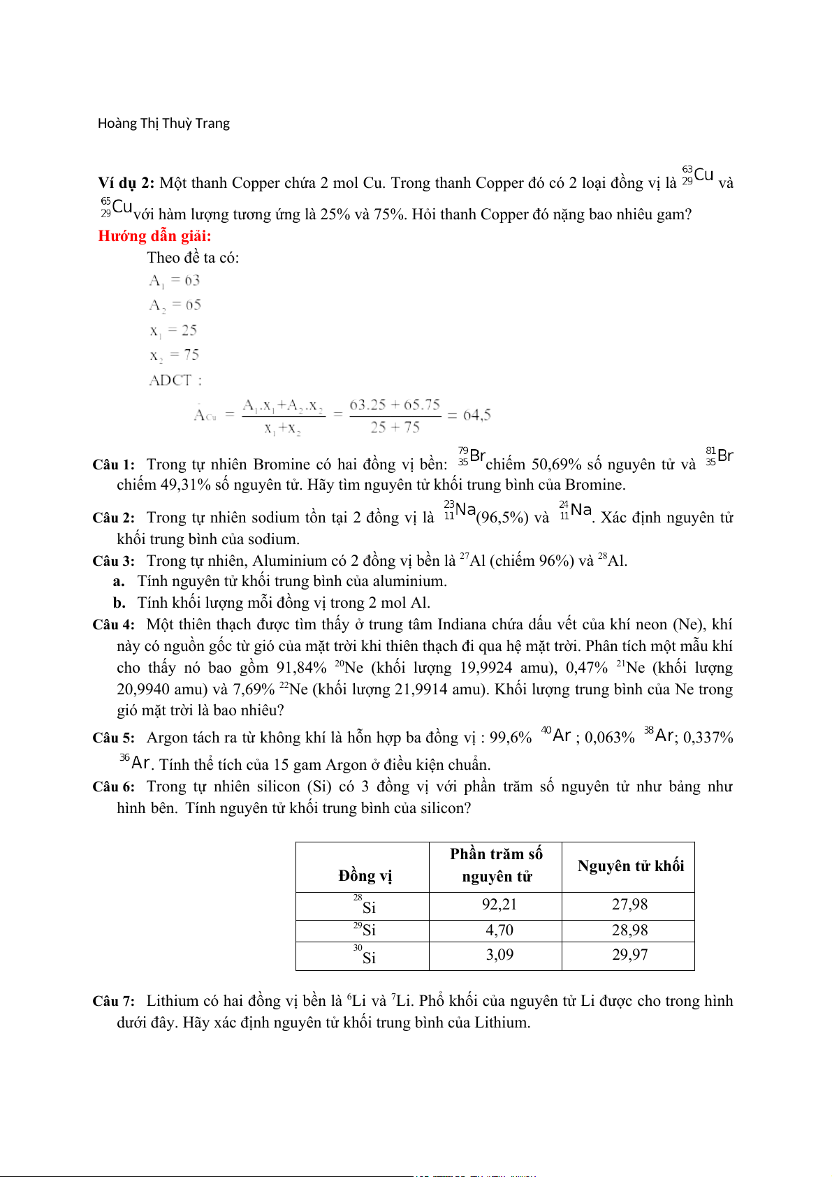 khối của Copper. Tính phần trăm về số nguyên tử mỗi đồng vị. Hướng dẫn giải: Theo đề ta có: Hoàng Thị Thuỳ Trang