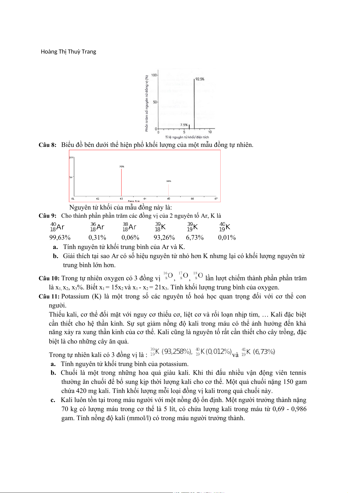 Câu 9: Cho thành phần phần trăm các đồng vị của 2 nguyên tố Ar, K là 99,63% 0,31% 0,06% 93,26% 6,73% 0,01%