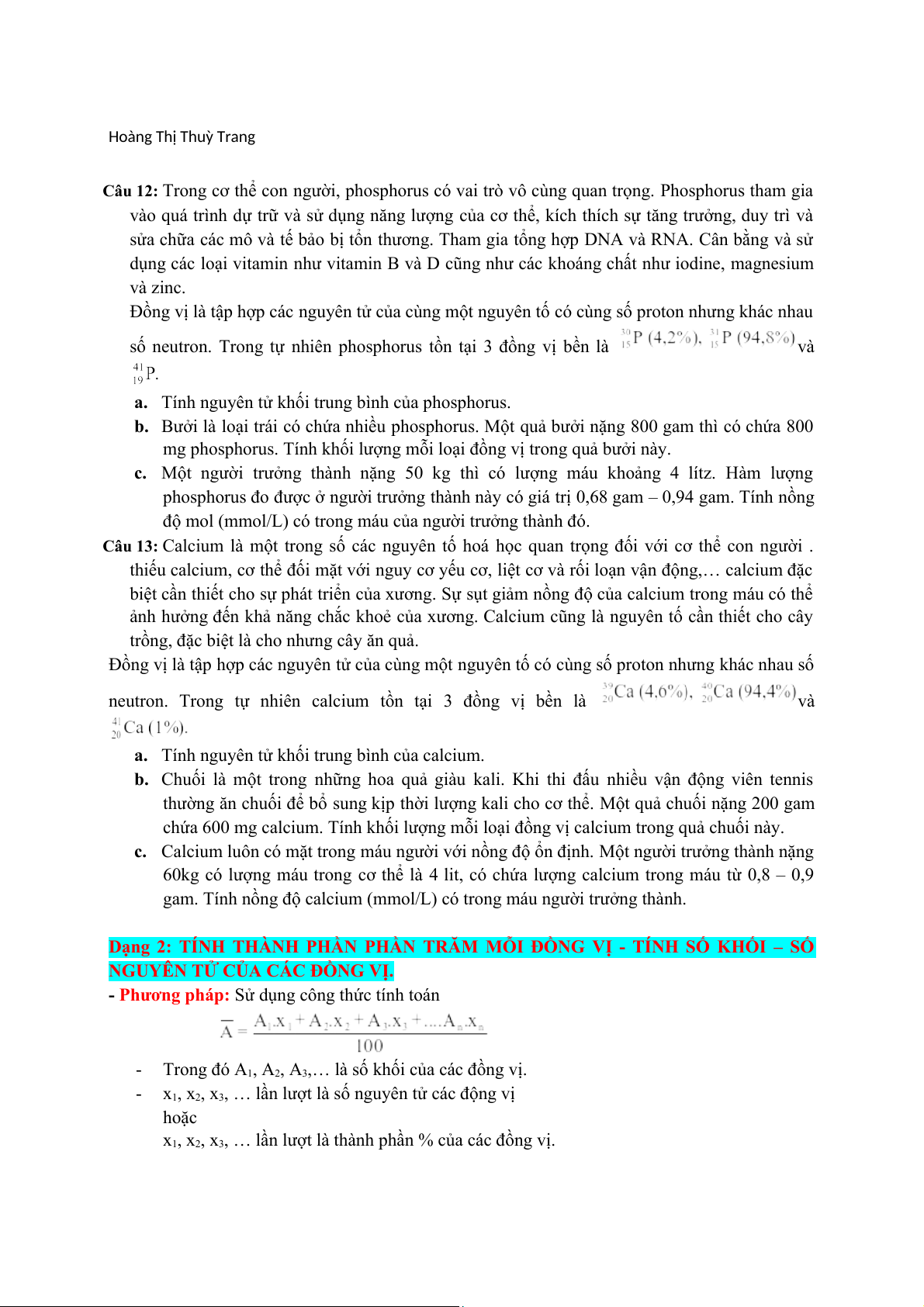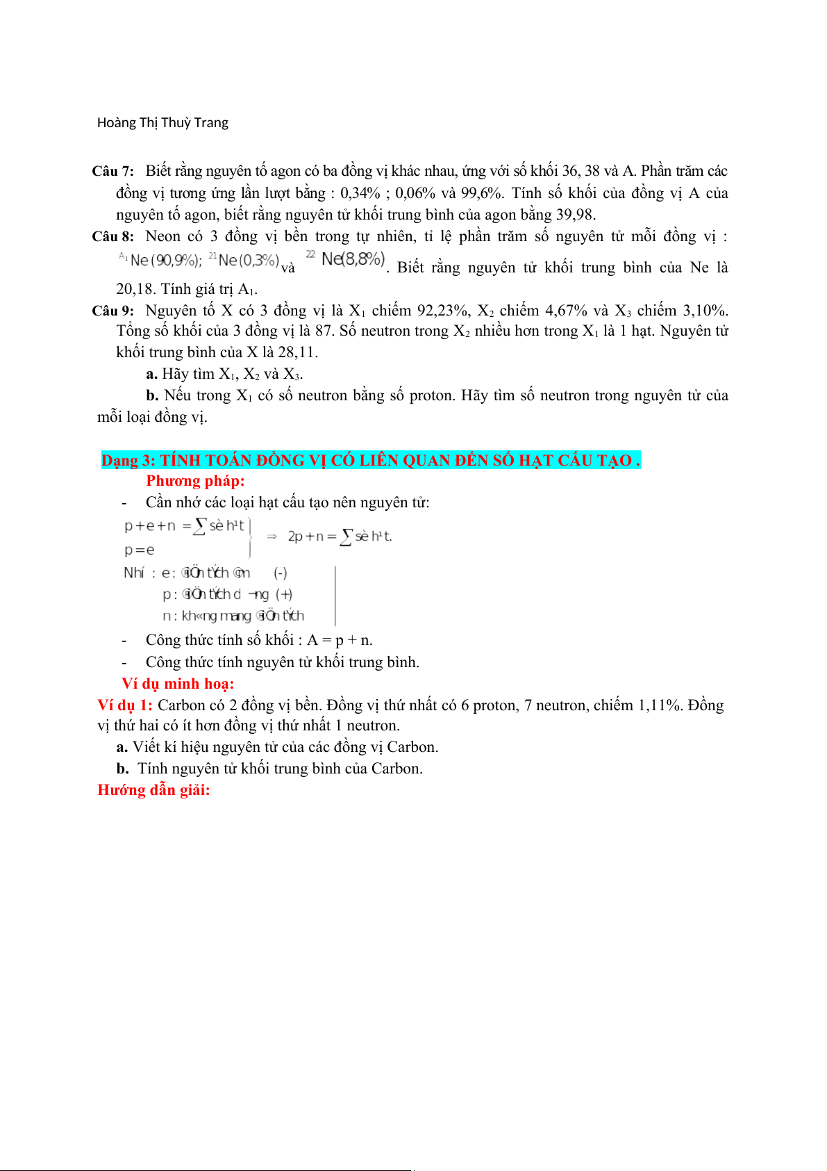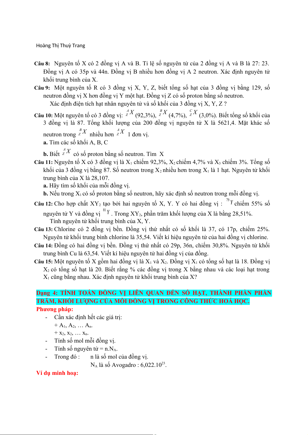 Dạng 2: TÍNH THÀNH PHẦN PHẦN TRĂM MỖI ĐỒNG VỊ - TÍNH SỐ KHỐI – SỐ