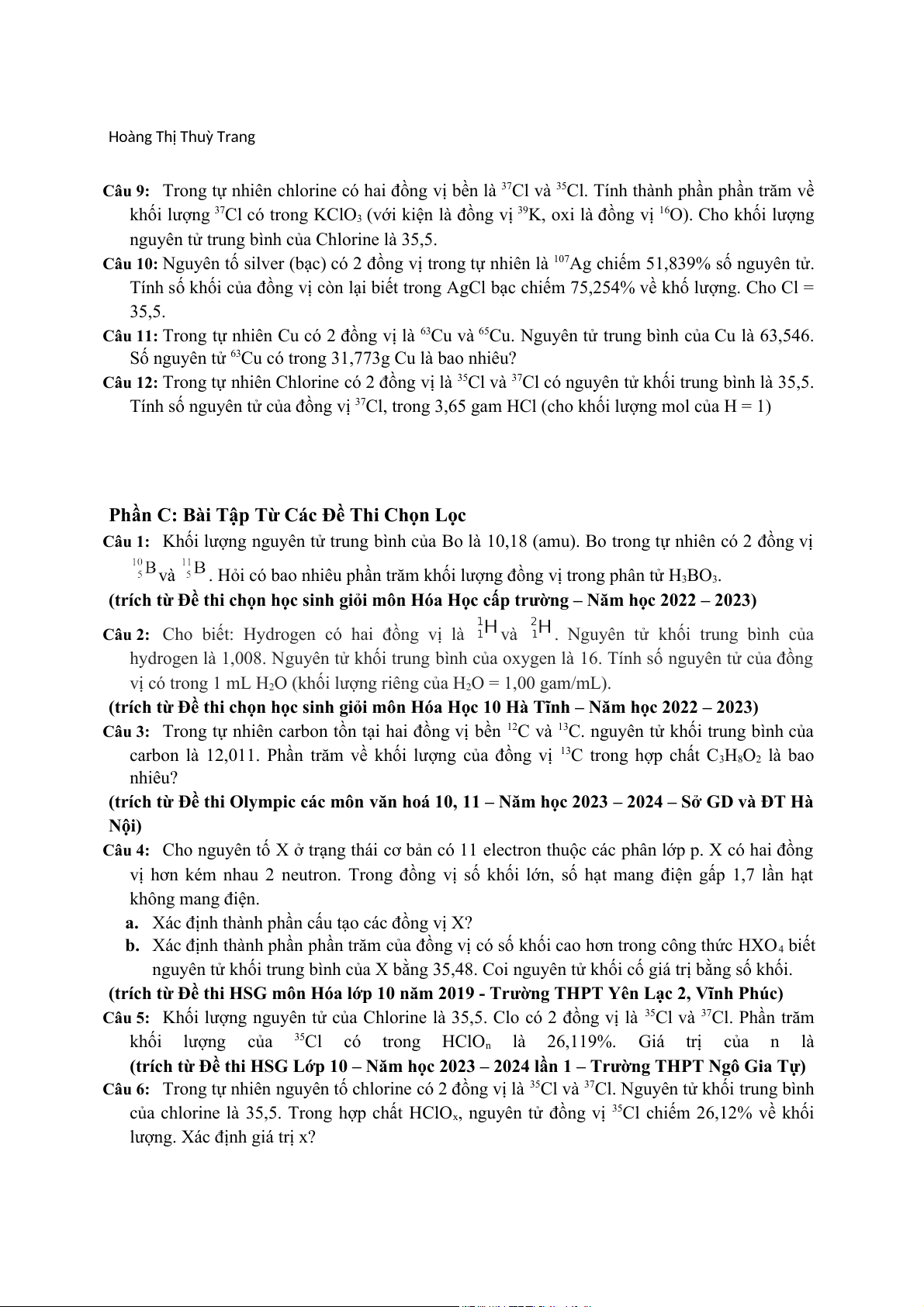 Câu 5: Khối lượng nguyên tử của Chlorine là 35,5. Clo có 2 đồng vị là Cl 35 và 37Cl. Phần trăm khối lượng của Cl 35