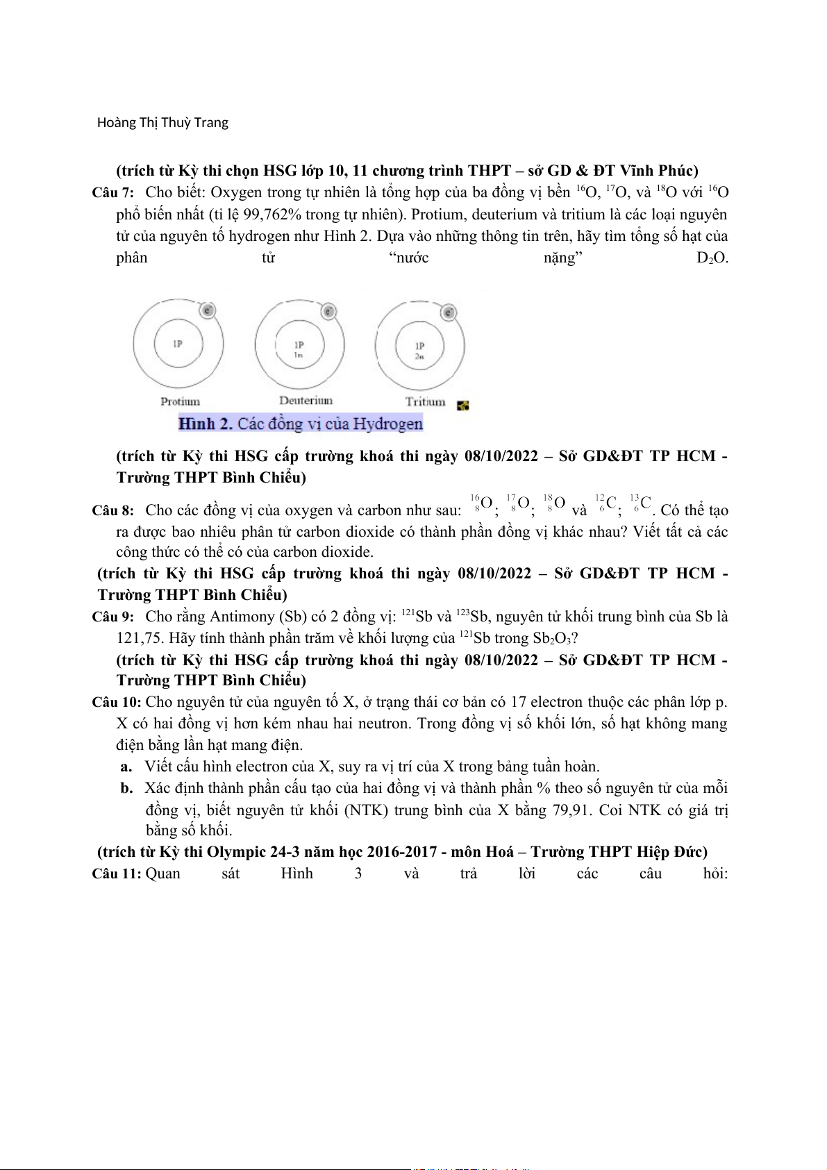 Câu 7: Cho biết: Oxygen trong tự nhiên là tổng hợp của ba đồng vị bền 16O, 17O, và 18O với O 16