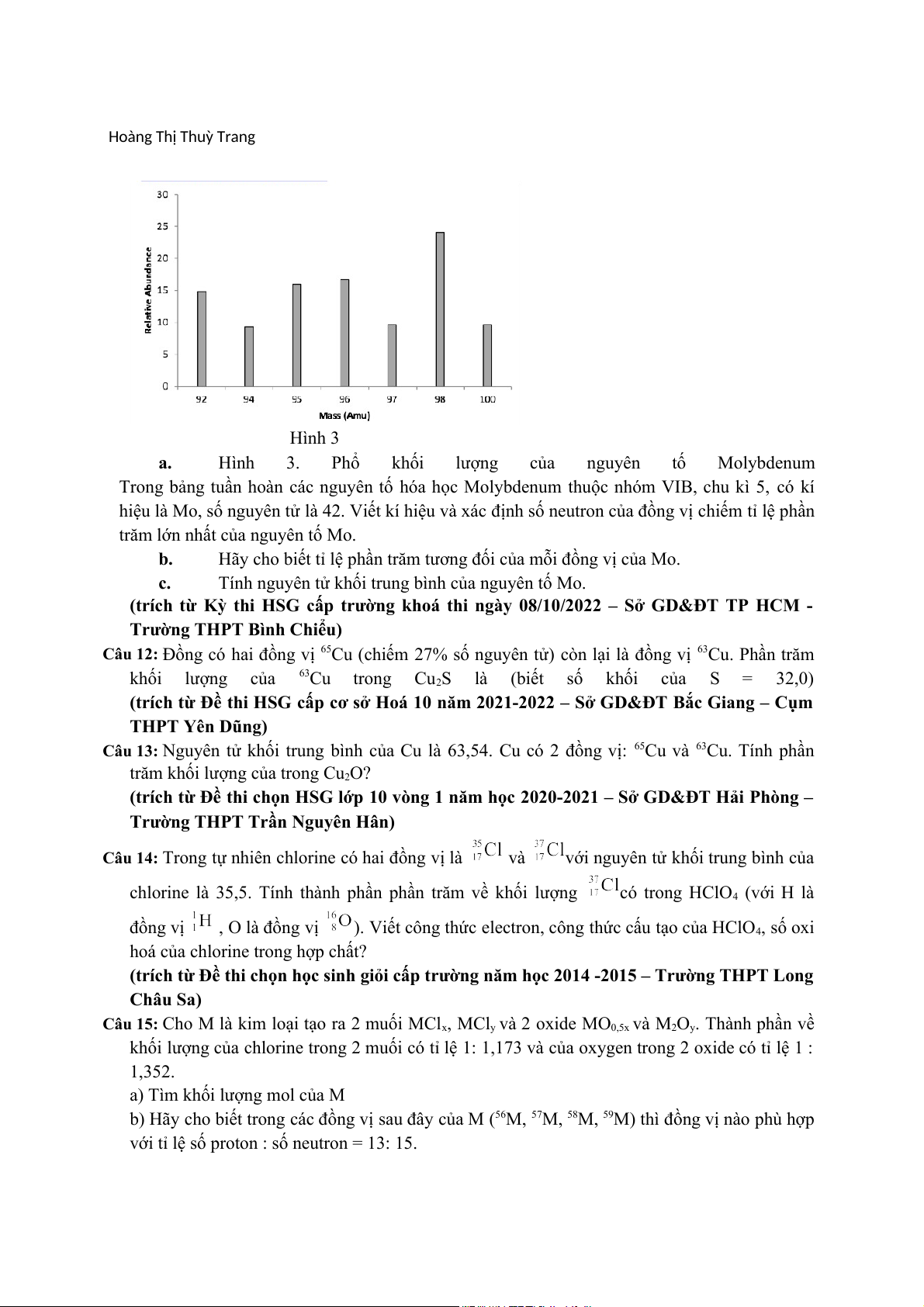 Câu 13: Nguyên tử khối trung bình của Cu là 63,54. Cu có 2 đồng vị: Cu 65 và 63Cu. Tính phần