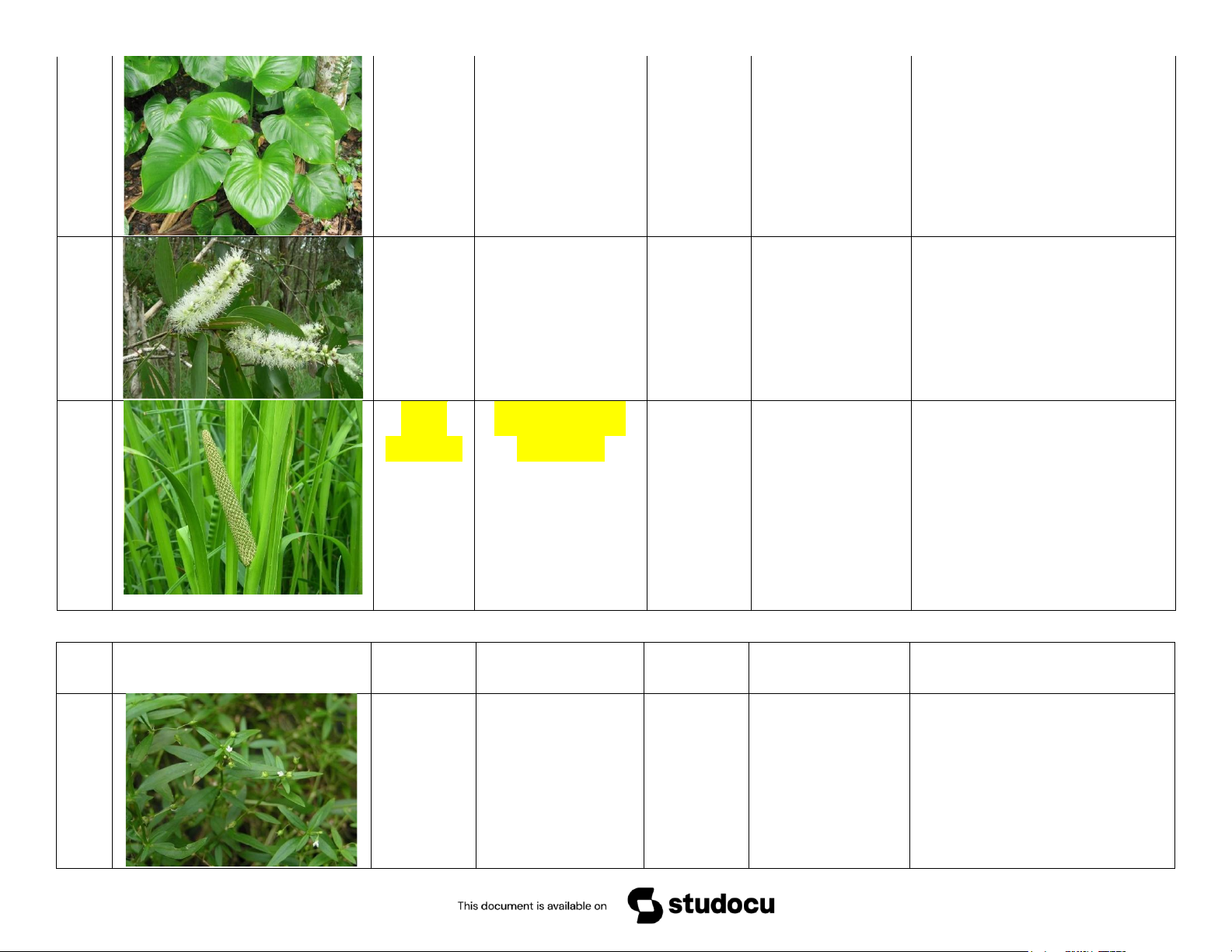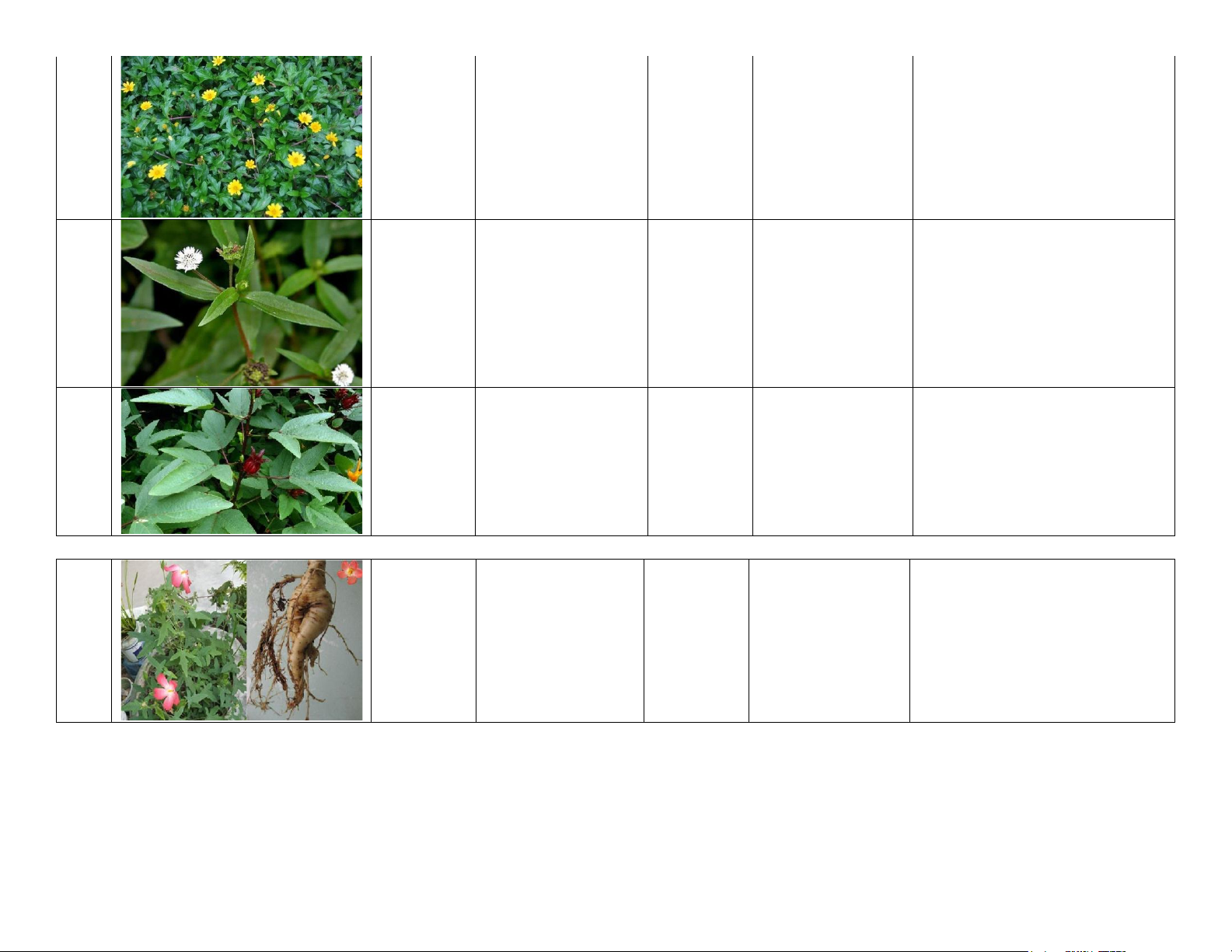 Phòng và trị mụn nhọt, mẩn Asteraceae ngứa, giải độc gan. lOMoAR cPSD| 45469857 3 Cỏ mự c Eclipta prostra ta Cả cây Coumarin: Kháng viêm, kháng khuẩn, Asteraceae wedelolacton