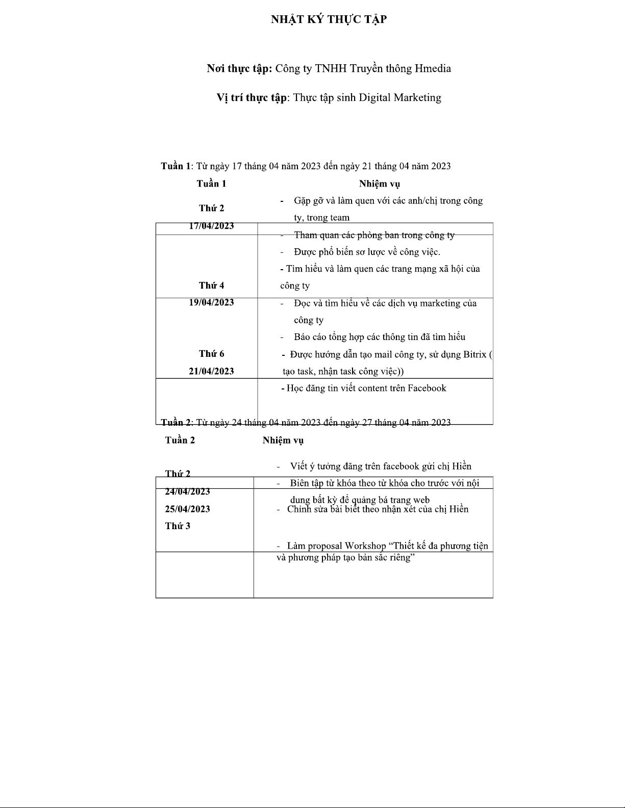 NHẬT KÝ THỰC TẬP DIGITAL MARKETING - CÔNG TY HMEDIA