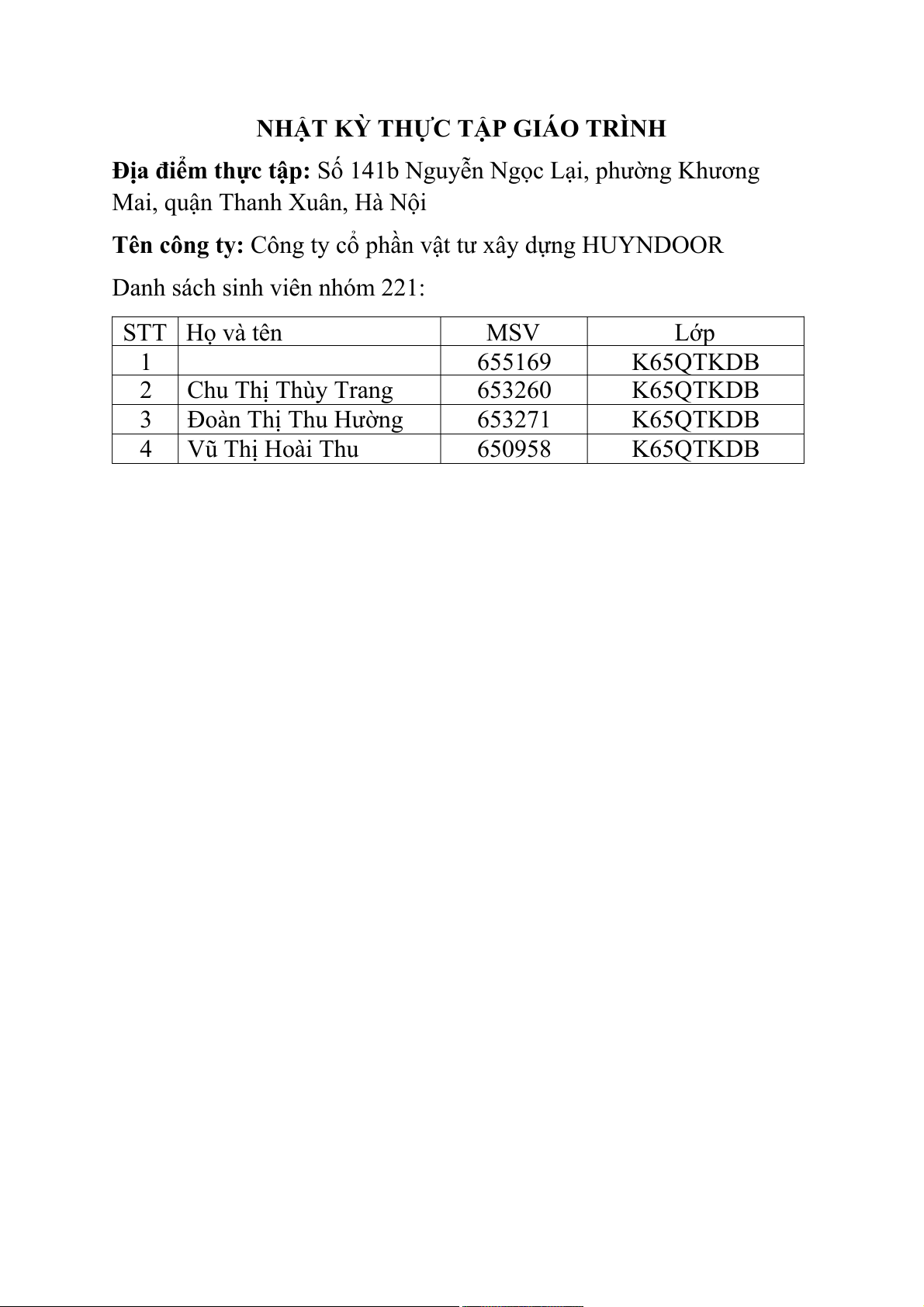 Danh sách sinh viên nhóm 221: STT Họ và tên MSV Lớp 1 655169 K65QTKDB 2 Chu Thị Thùy Trang 653260 K65QTKDB 3 Đoàn Thị Thu Hường 653271 K65QTKDB 4 Vũ Thị Hoài Thu 650958 K65QTKDB Khó Phương Ngày, tháng, năm Sinh viên Làm việc với Nội dung làm Kết quả khăn/ pháp thực thực hiện ai việc làm việc Kiến hiện nghị 14/11/2022 Sáng Cả nhóm Anh Vũ Duw - Quan sát,