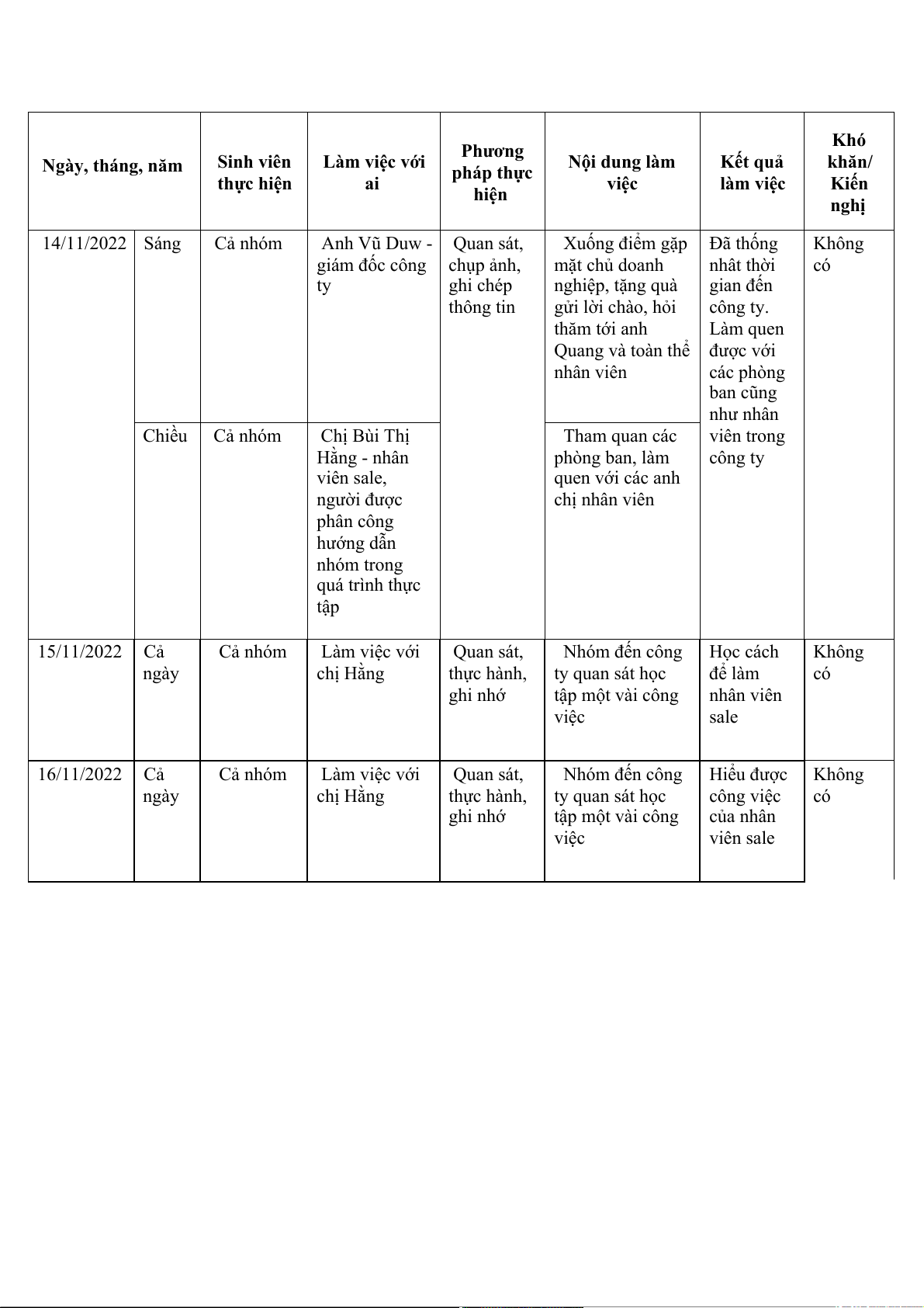 Tương tác với Quan sát, Nhóm đến công Hoàn thành Không các nhân viên giao tiếp ty thực tập, làm công việc có và khách hàng những công việc của công ty được giao Chiều Cả nhóm Cả nhóm Ghi chép, Tỏng hợp, chọn Có được thảo luận lọc các thông tin thông tin hữu ích cơ bản về công ty 21/11/2022 Sáng Cả nhóm