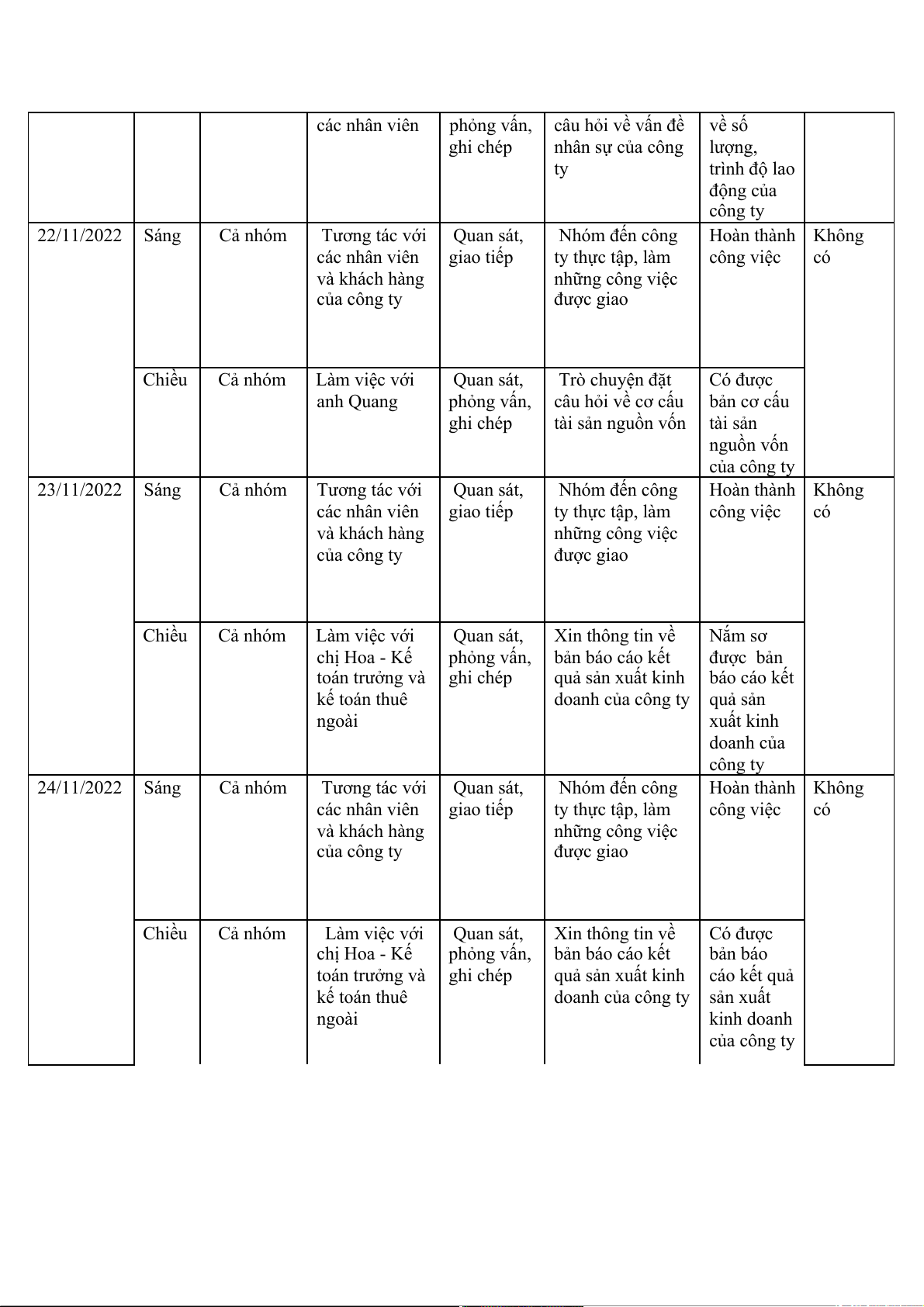 Tương tác với Quan sát, Nhóm đến công Hoàn thành Không các nhân viên giao tiếp ty thực tập, làm công việc có và khách hàng những công việc của công ty được giao Chiều Cả nhóm Làm việc với Quan sát, Xin thông tin về Có được chị Hoa - Kế