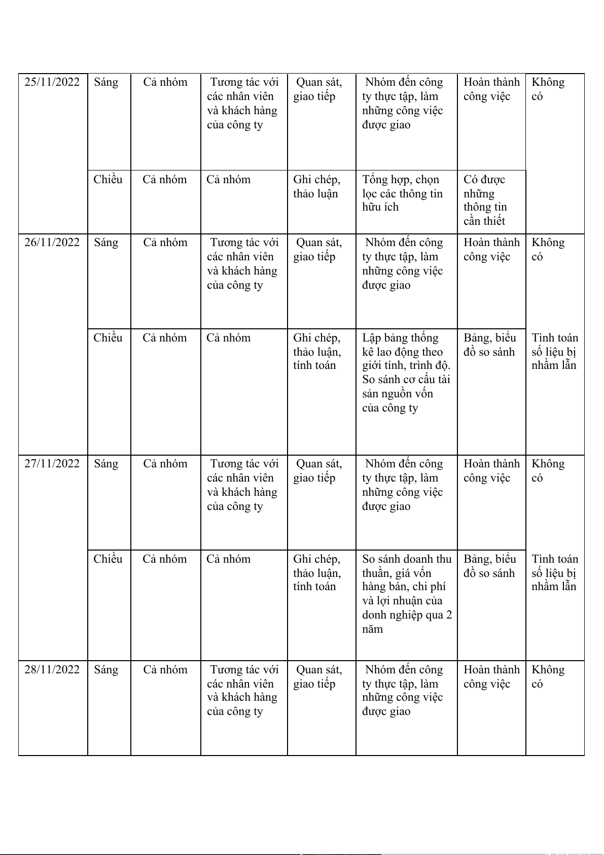 Tương tác với Quan sát, Nhóm đến công Hoàn thành Không các nhân viên giao tiếp ty thực tập, làm công việc có và khách hàng những công việc của công ty được giao Chiều Cả nhóm Cả nhóm Ghi chép, Tổng hợp, chọn Có được thảo luận lọc các thông tin những hữu ích thông tin cần thiết 26/11/2022 Sáng Cả nhóm