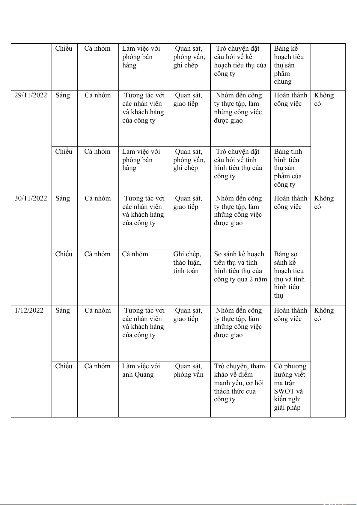 Tương tác với Quan sát, Nhóm đến công Hoàn thành Không các nhân viên giao tiếp ty thực tập, làm công việc có và khách hàng những công việc của công ty được giao Chiều Cả nhóm Cả nhóm Ghi chép, So sánh kế hoạch Bảng so thảo luận, tiêu thụ và tình sánh kế tính toán hình tiêu thụ của hoạch tieu