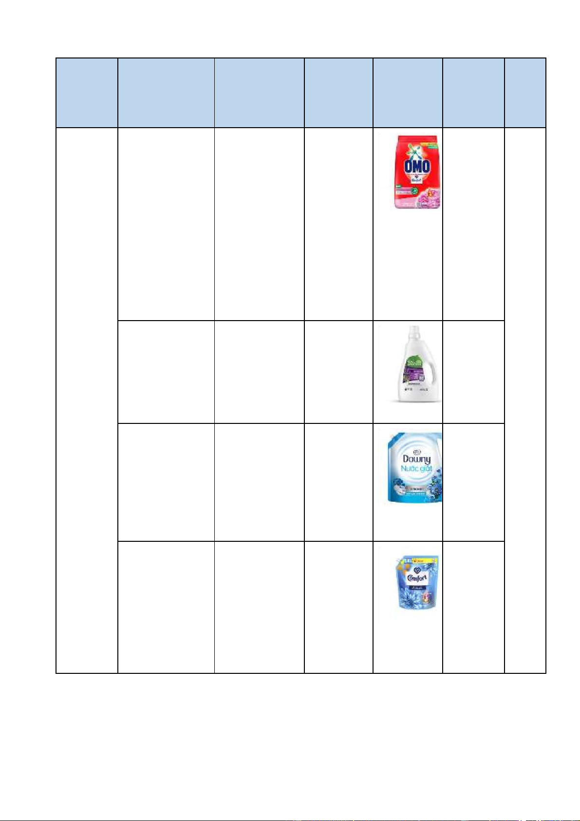 Giá (VNĐ/kg) Số lượng Hình ảnh Chất Thời cung cấp lượng gian giao hàng Unilever Bột giặt OMO 50.000/kg 100kg Đánh bay 3-4 những vết ngày bẩn cứng đầu nhất và thông dụng nhất như: vết dầu mỡ, vết cà phê, vết bẩn sinh học,... Nước giặt 80.000/lít 100 lít Sạch bẩn, Seventh sản phẩm Generation còn khử mùi, kháng khuẩn Nước giặt 60.000/lít 100 lít Có mùi Downy biển thơm và xanh lưu hương lâu, khả năng làm sạch cao Nước xả vải 60.000/lít 100 lít Giúp Comfort nắng quần áo mai luôn mềm mịn, tươi mới, hạn chế tình trạng sờn rách