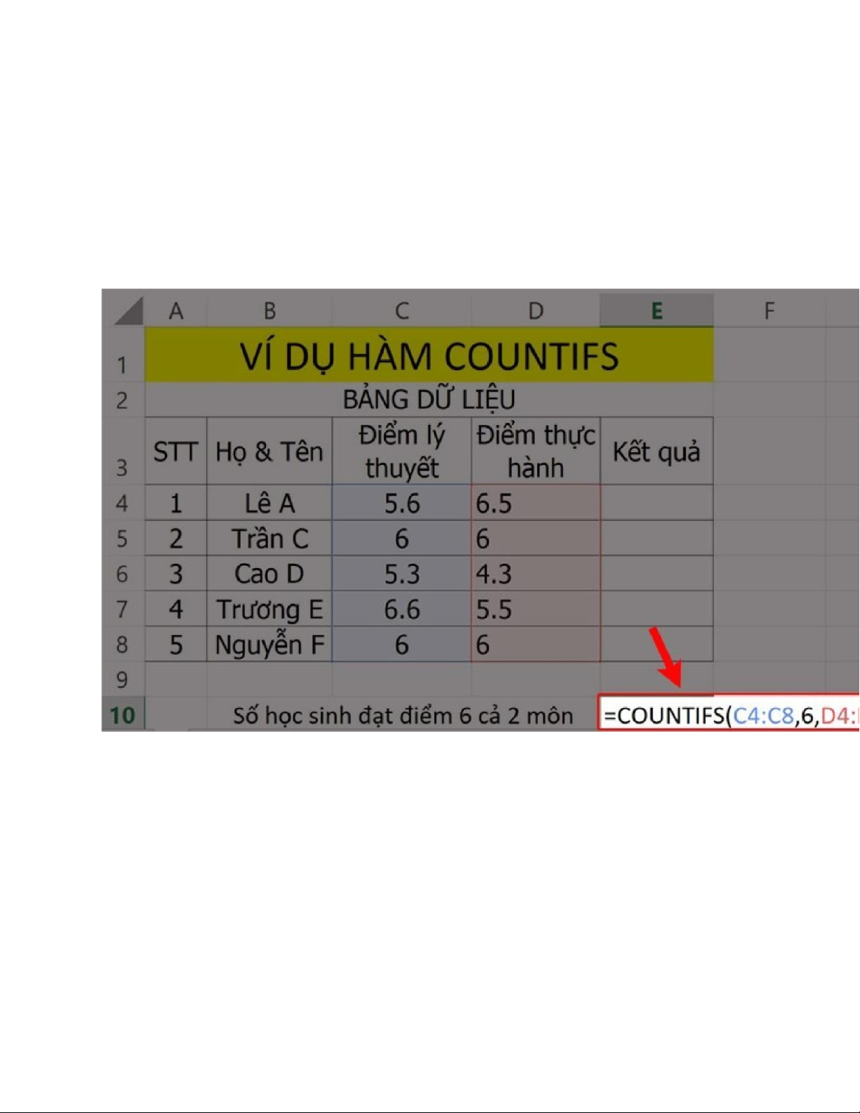 Bước 1: Mình nhập hàm =COUNTIFS(C4:C8,6,D4:D8,6) vào bảng tính Excel.