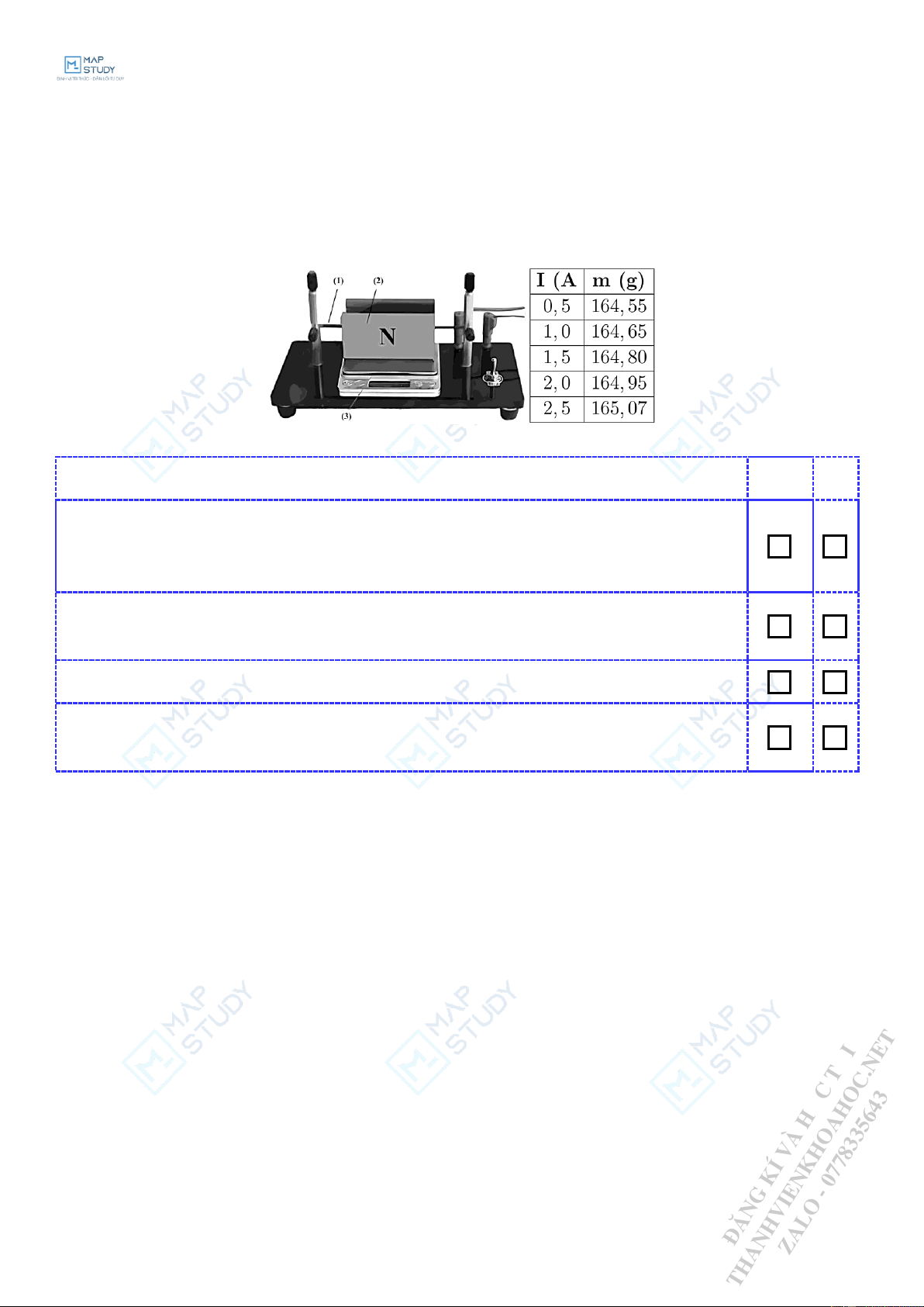 = 0 số chỉ của cân là 164,40 gam. Khi cho dòng điện chạy qua đoạn dây, học sinh thu được các số liệu ghi ở bảng sau: Mệnh đề Đúng Sai
