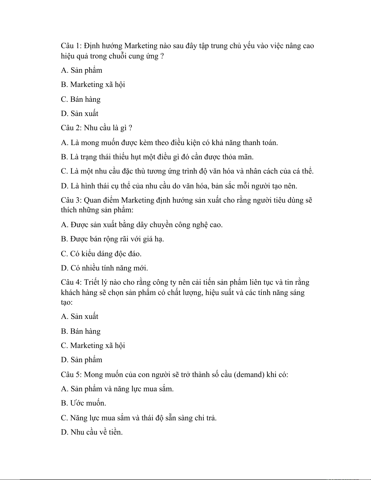 hiệu quả trong chuỗi cung ứng ? A. Sản phẩm B. Marketing xã hội C. Bán hàng D. Sản xuất Câu 2: Nhu cầu là gì ?