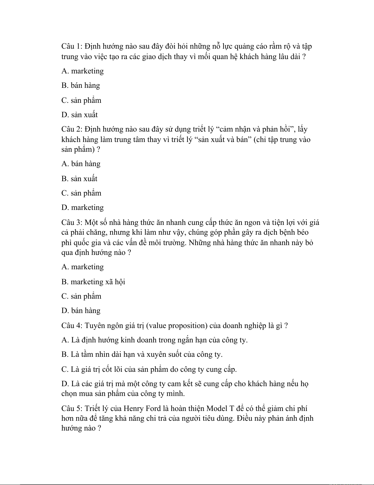 Câu 1: Định hướng Marketing nào sau đây tập trung chủ yếu vào việc nâng cao