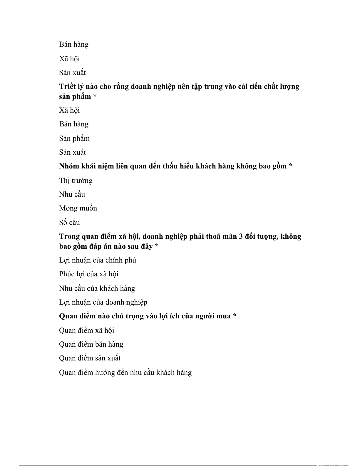 Triết lý nào cho rằng doanh nghiệp nên tập trung vào cải tiến chất lượng sản phẩm * Xã hội Bán hàng Sản phẩm Sản xuất