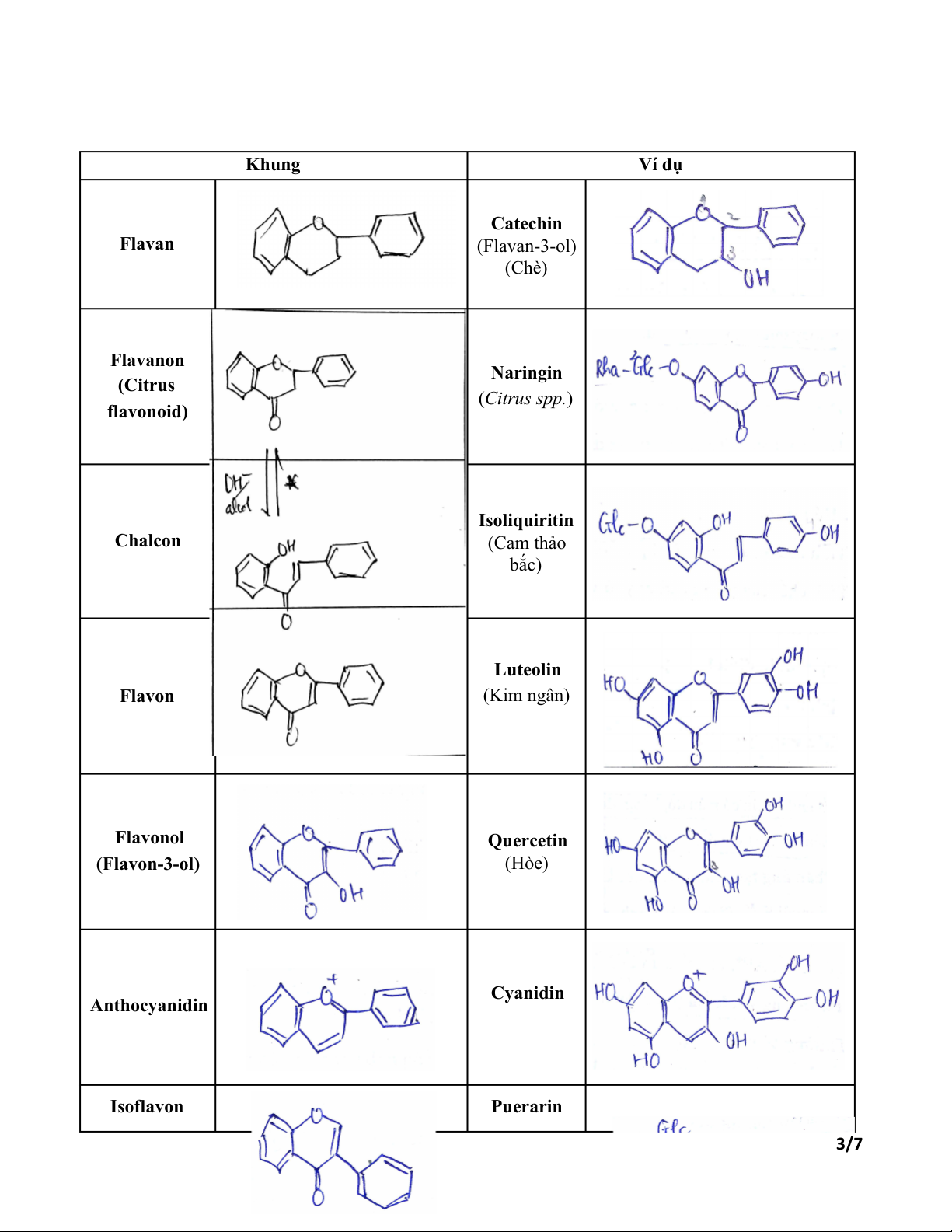- Nhóm Biflavonoid, triflavonoid: Dimer, trimer 2/7 Khung Ví dụ Catechin Flavan (Flavan-3-ol) (Chè) Flavanon Naringin (Citrus (Citrus spp.) flavonoid) Isoliquiritin Chalcon (Cam thảo bắc) Luteolin Flavon (Kim ngân) Flavonol Quercetin (Flavon-3-ol) (Hòe) Cyanidin Anthocyanidin Isoflavon Puerarin 3/7 (Sắn)