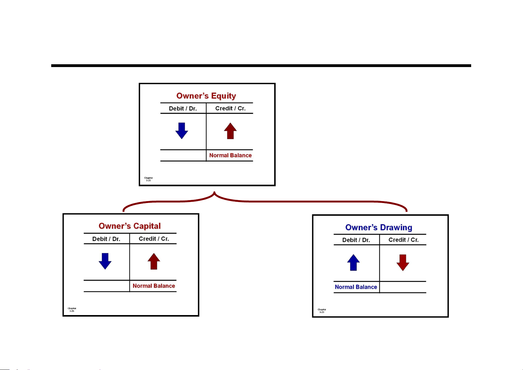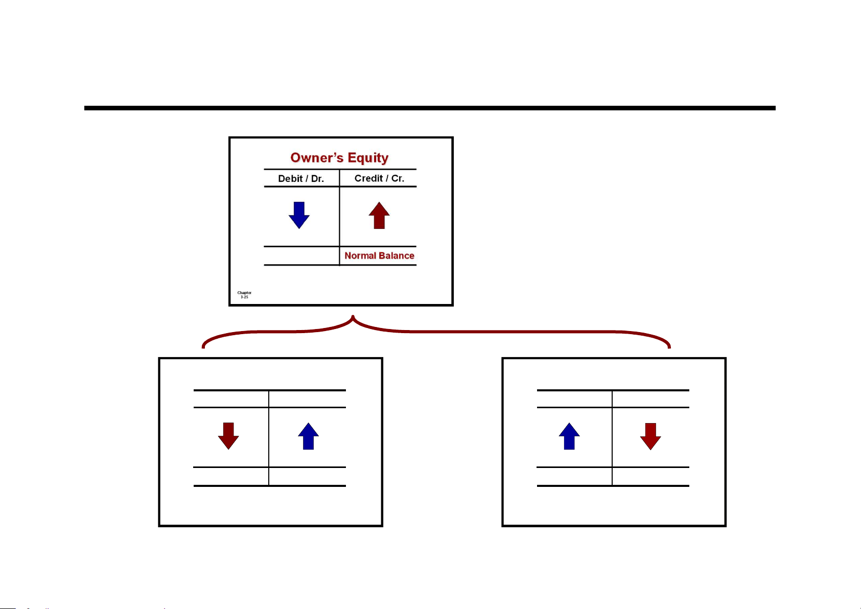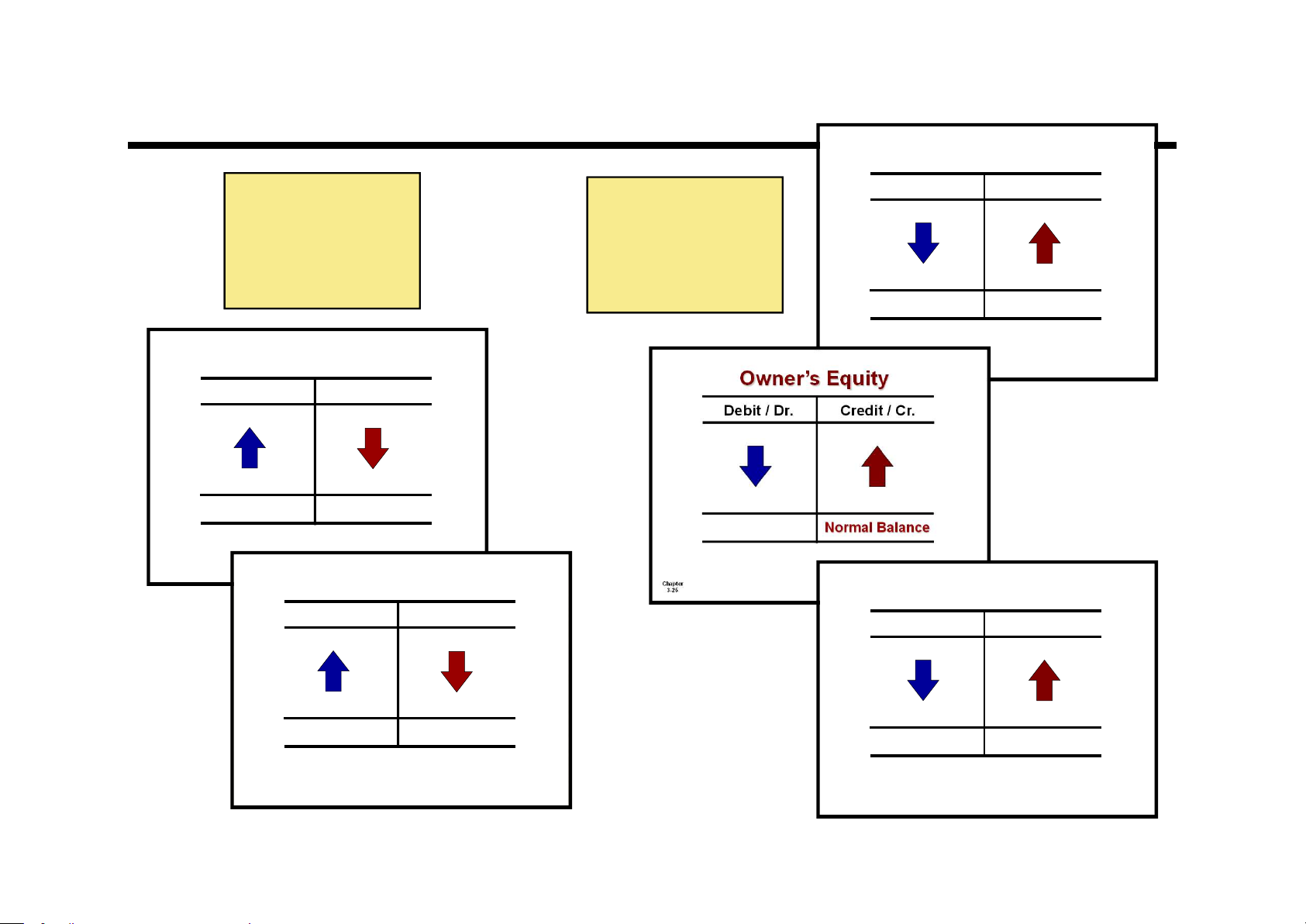 entries, the account will have a credit balance. Account Name Debit / Dr. Credit / Cr. Transaction #1 $10,000 $3,000 Transaction #2 8,000 Transaction #3 Balance $1,000 2-5 LO 1 Debits and Credits Assets Liabilities Debit / Dr. Credit / Cr. Debit / Dr. Credit / Cr. Normal Balance Normal Balance Chapter Chapter 3-23 3-24