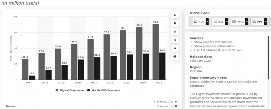 Báo cáo của Statista (2022) cho thấy, có 51,8 triệu người dùng thương mại kỹ thuật số tại Việt Nam vào năm 2021. Đến năm 2025, Statista ước tính số lượng người dùng trong phân khúc này sẽ tăng lên 70,9 triệu. Số lượng người dùng thanh toán qua POS di động cùng lúc sẽ tăng từ 28,6 triệu lên khoảng 34,6 triệu (Hình 2). Chính vì vậy, thị trường thanh toán điện tử tại Việt Nam còn nhiều dư địa để tăng trưởng mạnh mẽ trong thời gian tới. Việc tăng cường sử dụng các dịch vụ thanh toán kỹ thuật số, sẽ giúp Việt Nam nhanh chóng khai phá tiềm năng thị trường trong lĩnh vực này.