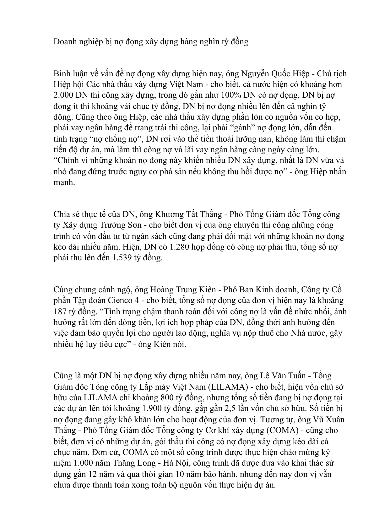 “Chính vì những khoản nợ đọng này khiến nhiều DN xây dựng, nhất là DN vừa và