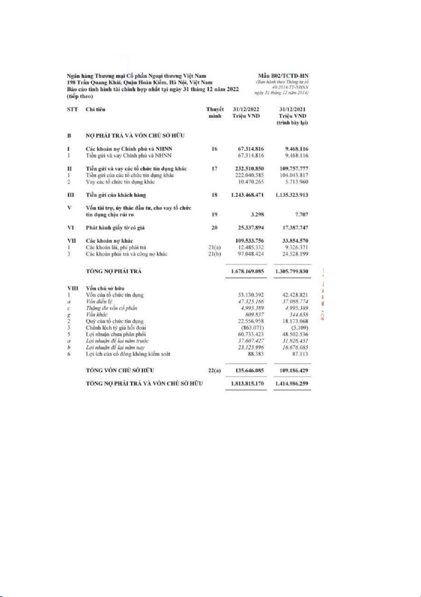 Nguồn: Báo cáo tài chính hợp nhất của VCB năm 2022