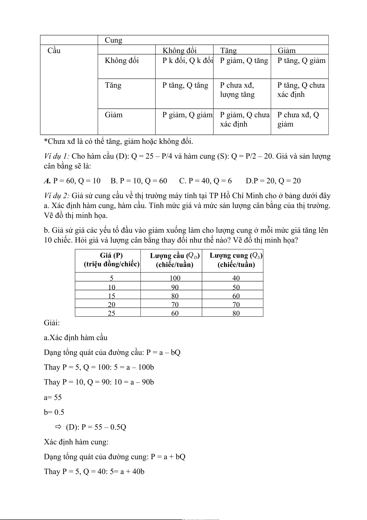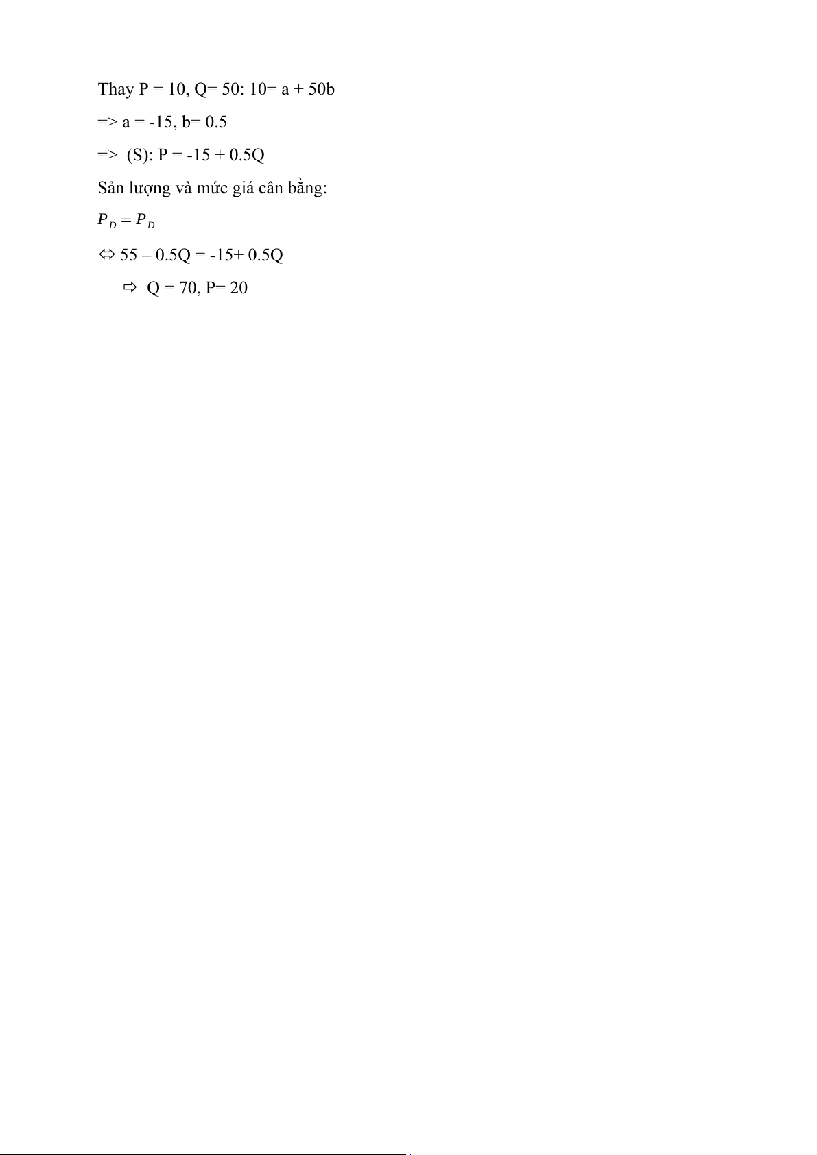 Thay P = 10, Q= 50: 10= a + 50b => a = -15, b= 0.5 => (S): P = -15 + 0.5Q