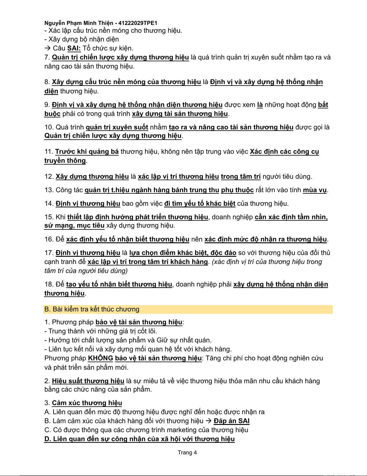 Câu 4. Củng cố thương hiệu là hoạt động nhằm đảm bảo giá trị thương hiệu theo thời gian.