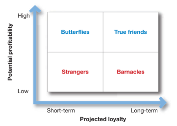 Customer lifetime value - The value of the entire stream of purchases a customer makes over a lifetime of patronage.