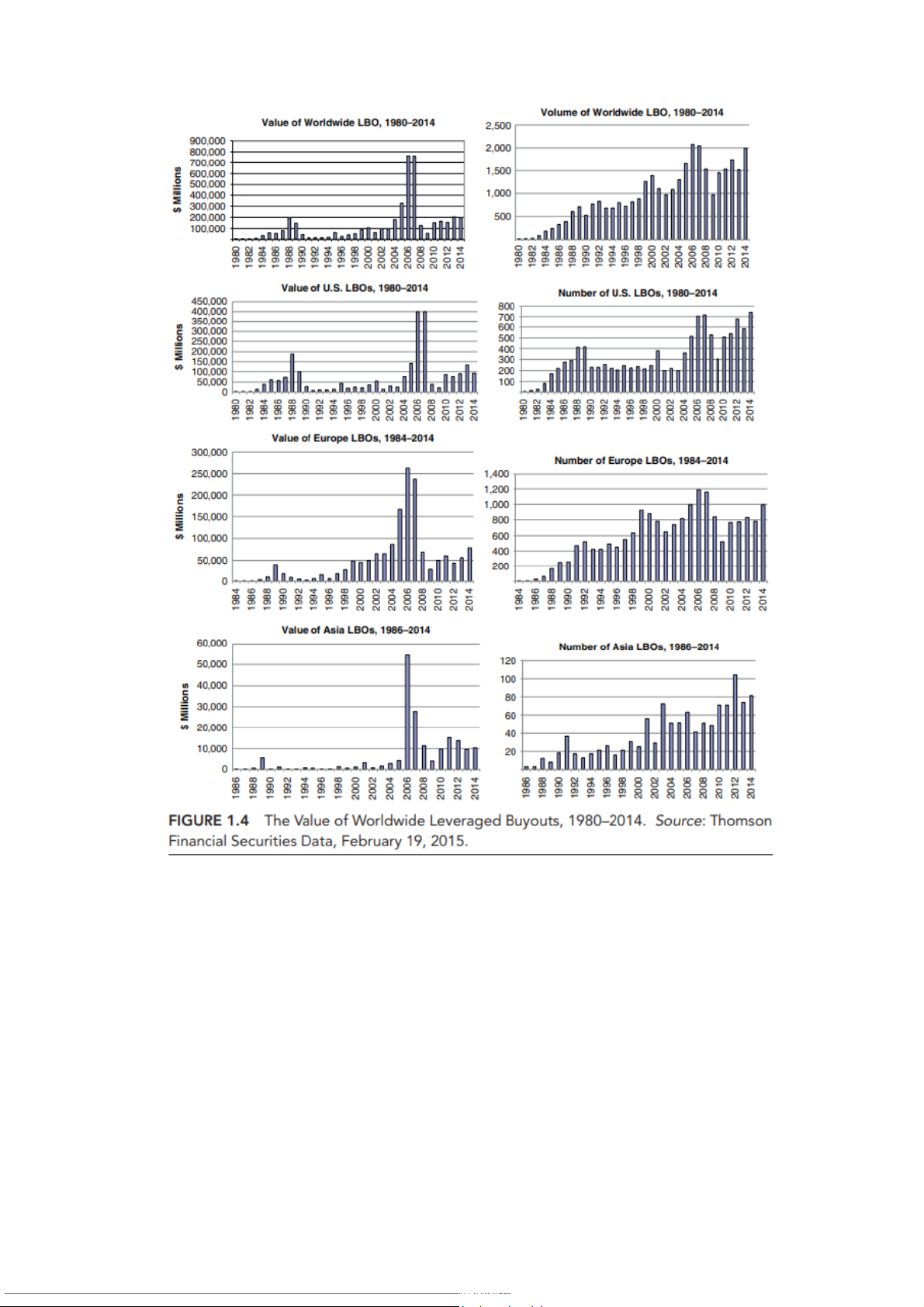 Hình 1.1 Giá trị của M&A giai đoạn 1980–2014: (a) Hoa Kỳ và (b) Châu Âu.