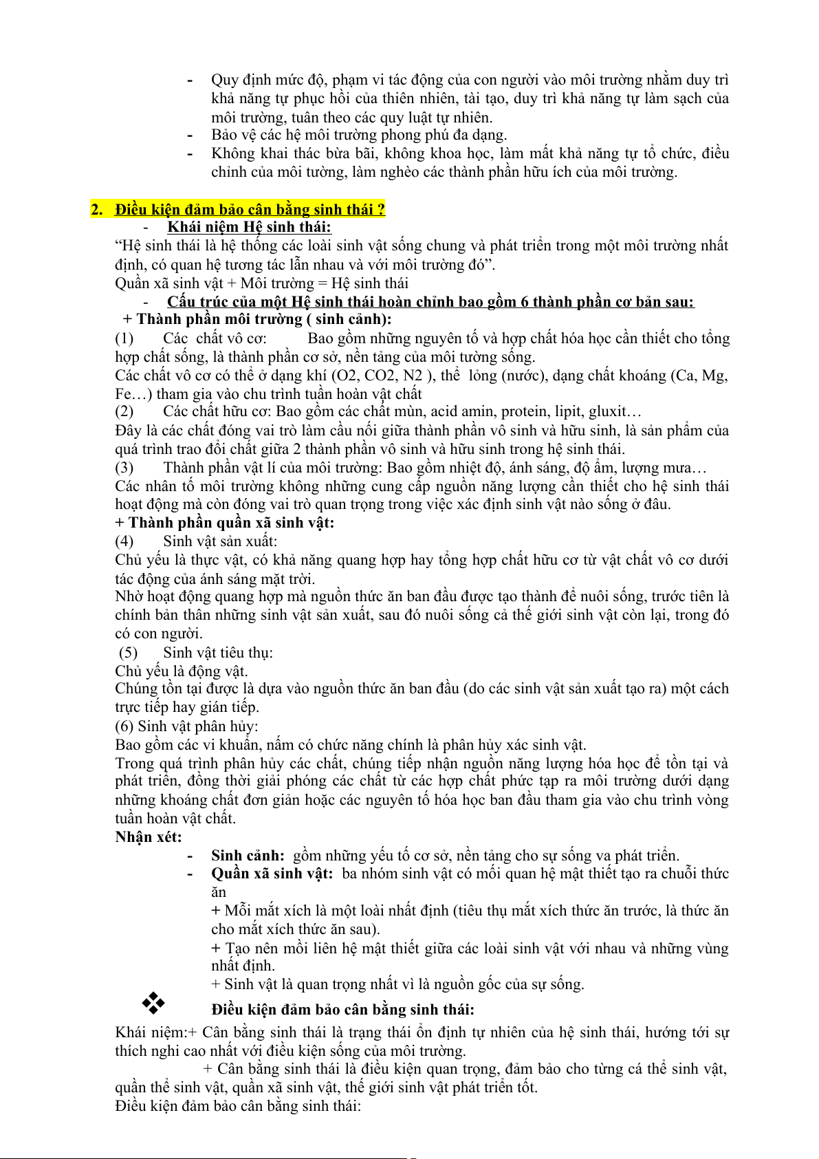 2. Điều kiện đảm bảo cân bằng sinh thái ?