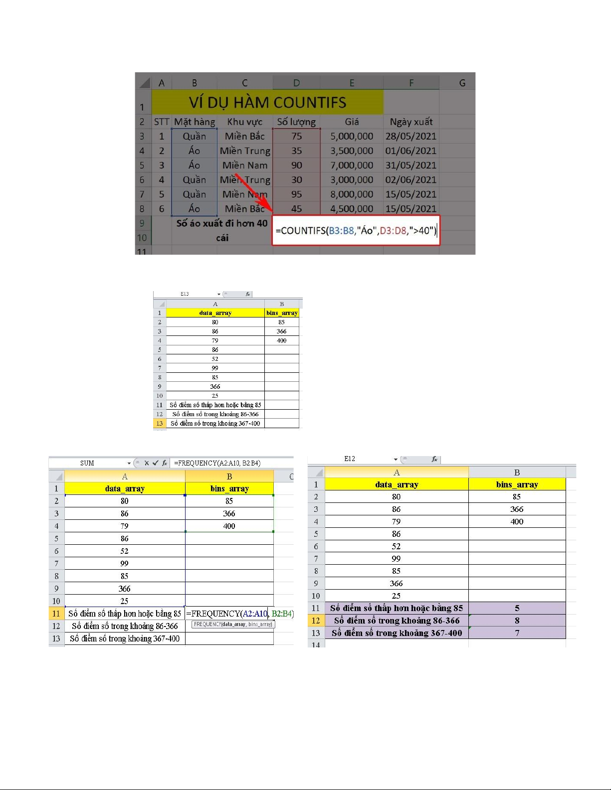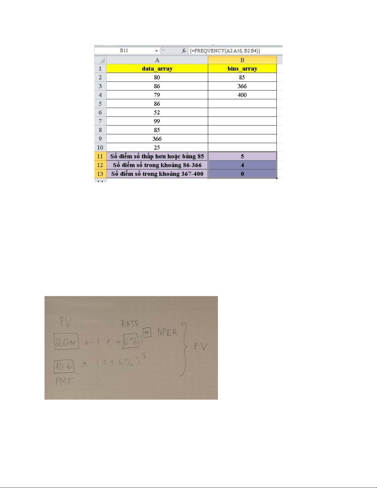 g)FREQUENCY: =FREQUENCY(data_array;bins_array) VD: Số điểm <=85 Số điểm 86-366 Số điểm 367-400