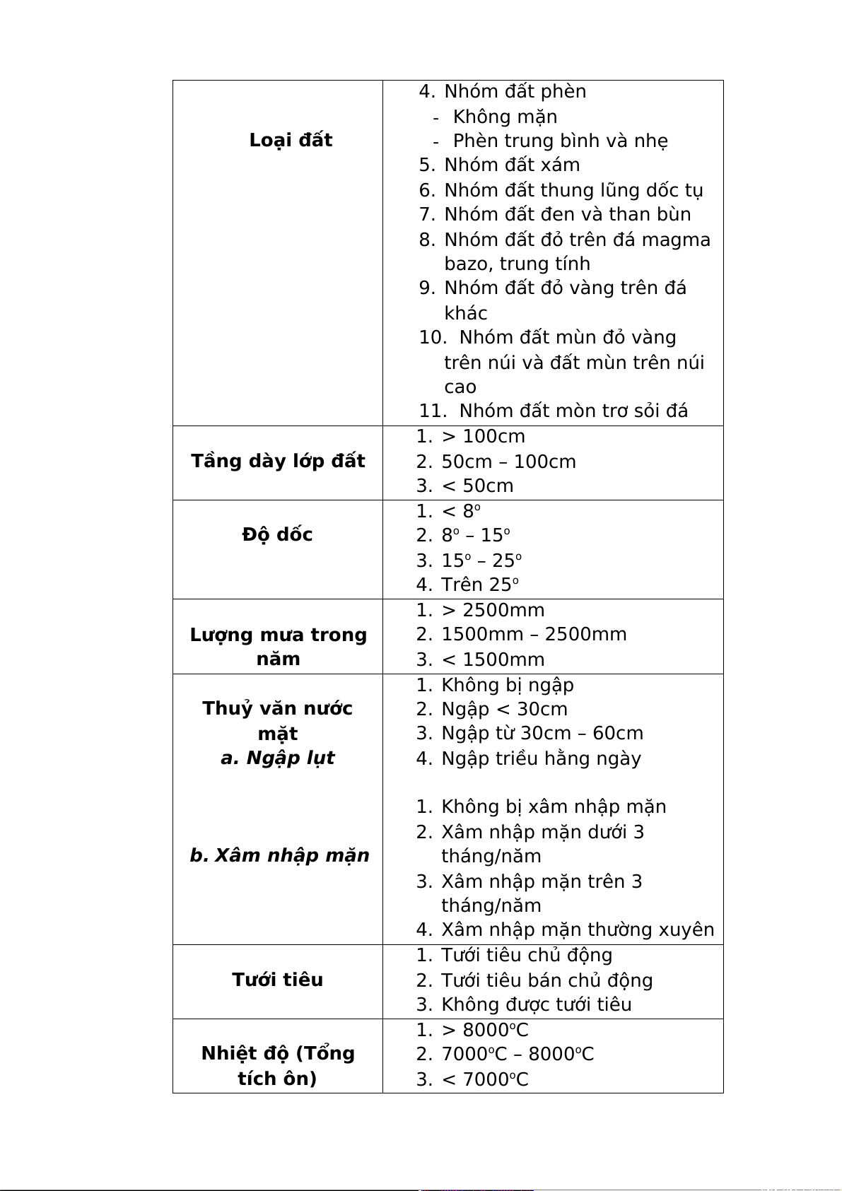 Tầng dày lớp đất 2. 50cm – 100cm 3. < 50cm 1. < 8o Độ dốc 2. 8o – 15o 3. 15o – 25o 4. Trên 25o 1. > 2500mm Lượng mưa trong 2. 1500mm – 2500mm năm 3. < 1500mm 1. Không bị ngập Thuỷ văn nước 2. Ngập < 30cm mặt 3. Ngập từ 30cm – 60cm a. Ngập lụt 4. Ngập triều hằng ngày