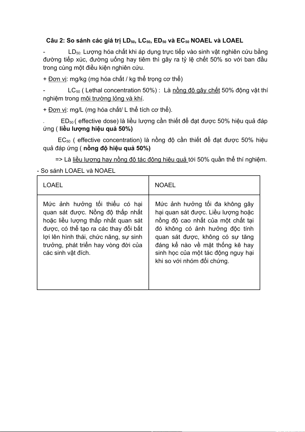 Câu 2: So sánh các giá trị LD50, LC50, ED50 và EC50 NOAEL và LOAEL