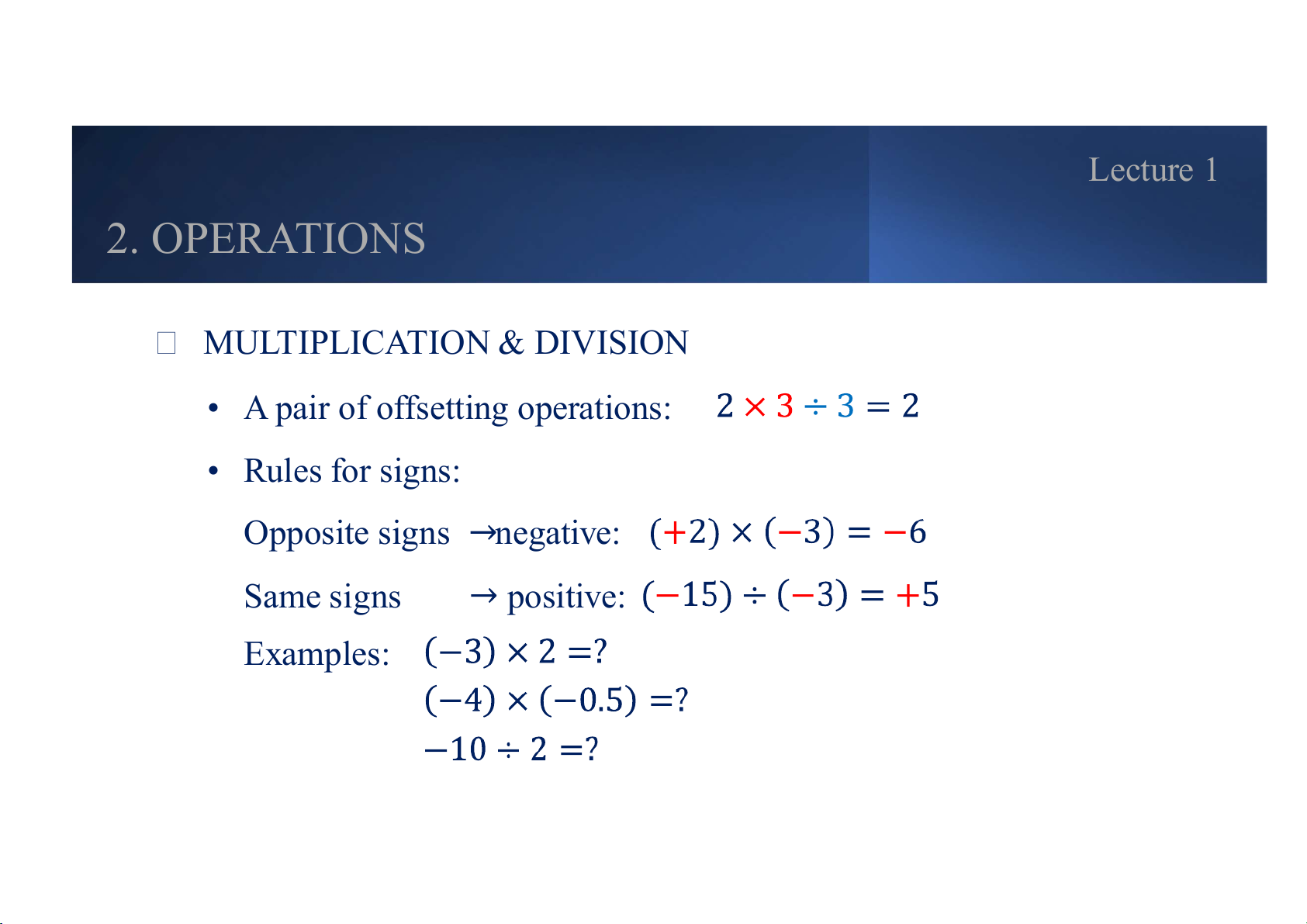 • A pair of offsetting operations: • Rules for signs: Opposite signs negative: Same signs positive: Examples: Lecture 1 2. OPERATIONS MULTIPLICATION & DIVISION • Rules for fractions: