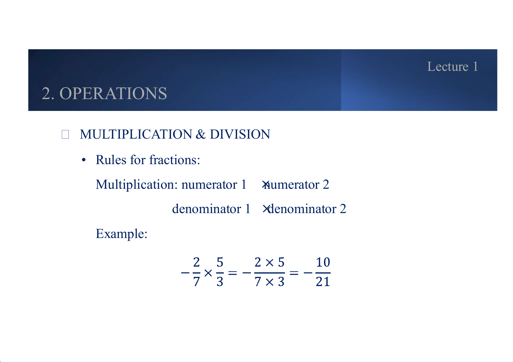Multiplication: numerator 1 numerator 2 denominator 1 denominator 2 Example: Lecture 1 2. OPERATIONS MULTIPLICATION & DIVISION • Rules for fractions: