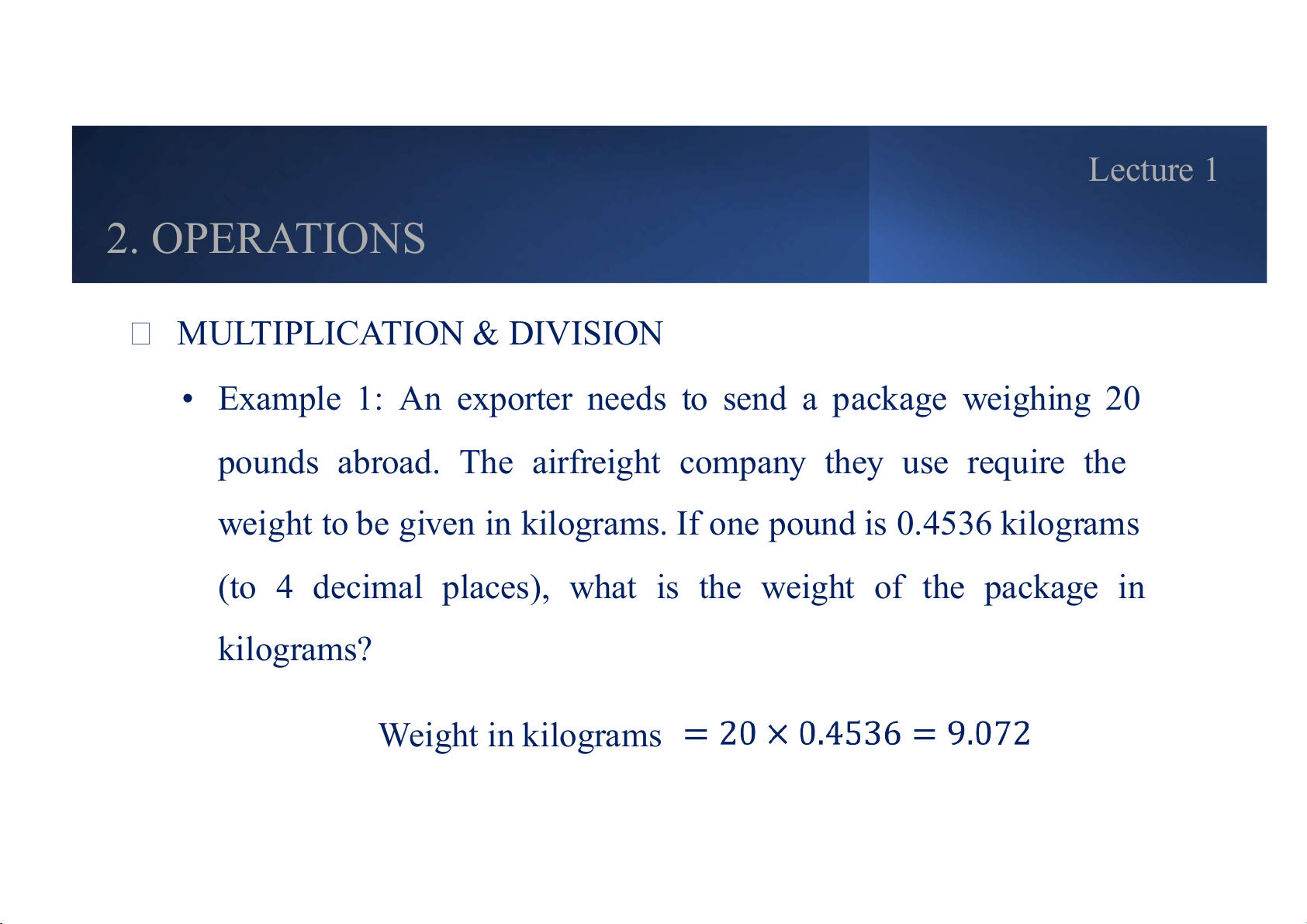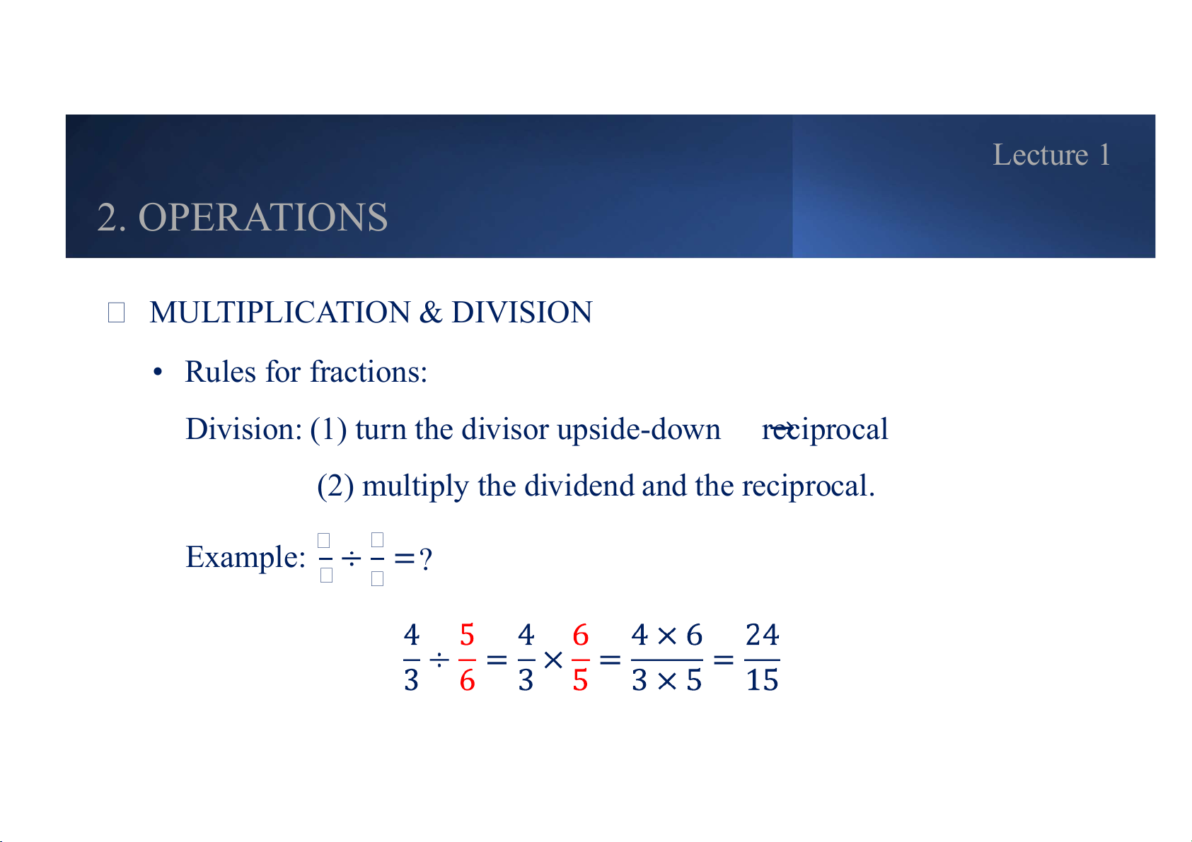 (2) multiply the dividend and the reciprocal. Example: ? Lecture 1 2. OPERATIONS MULTIPLICATION & DIVISION