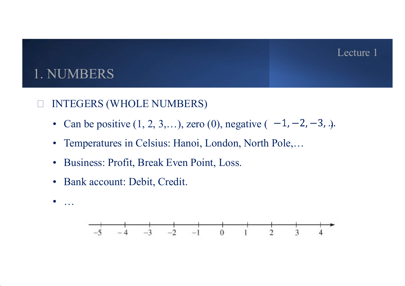 diagnostics (e.g. blood pressure), and economic statistics (e.g. profit and GDP). Lecture 1 1. NUMBERS INTEGERS (WHOLE NUMBERS)