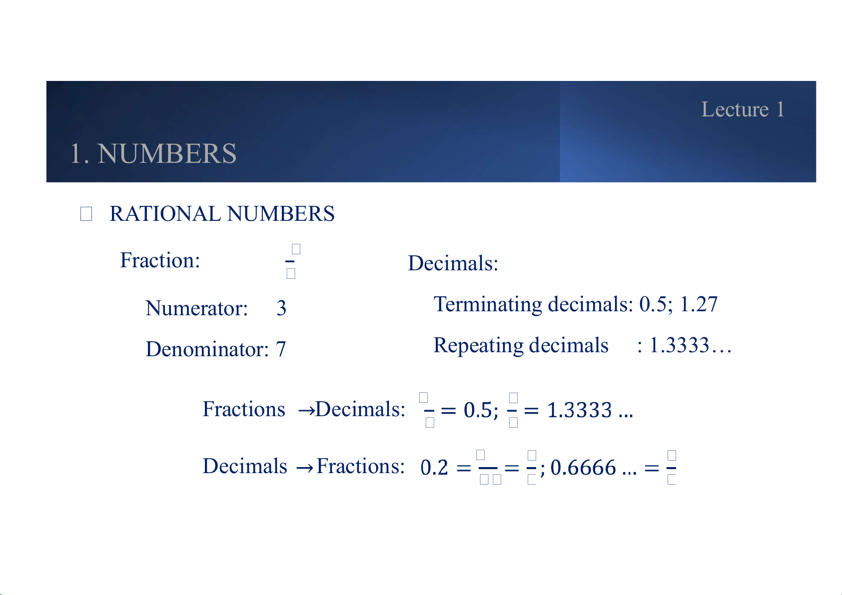 • Integers (as special rational numbers): Lecture 1 1. NUMBERS RATIONAL NUMBERS Fraction: Decimals: Numerator: 3