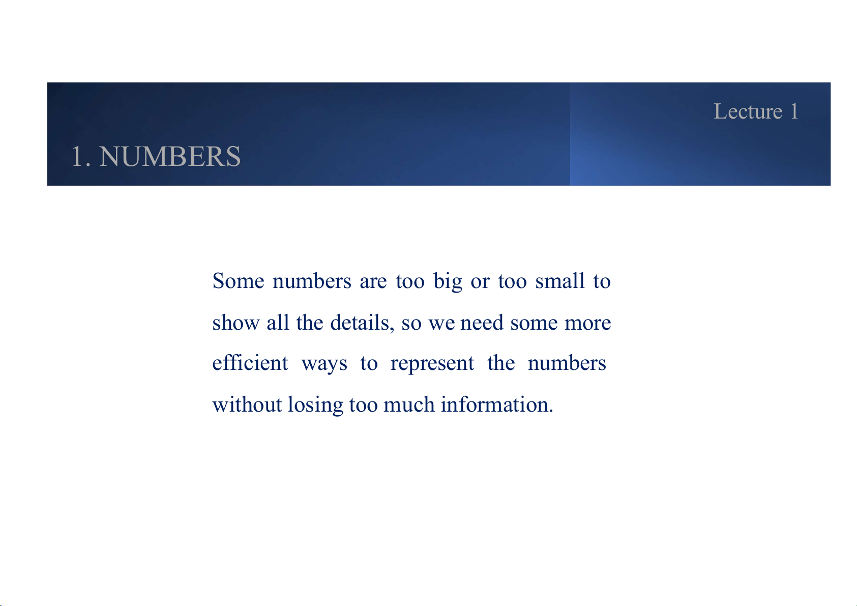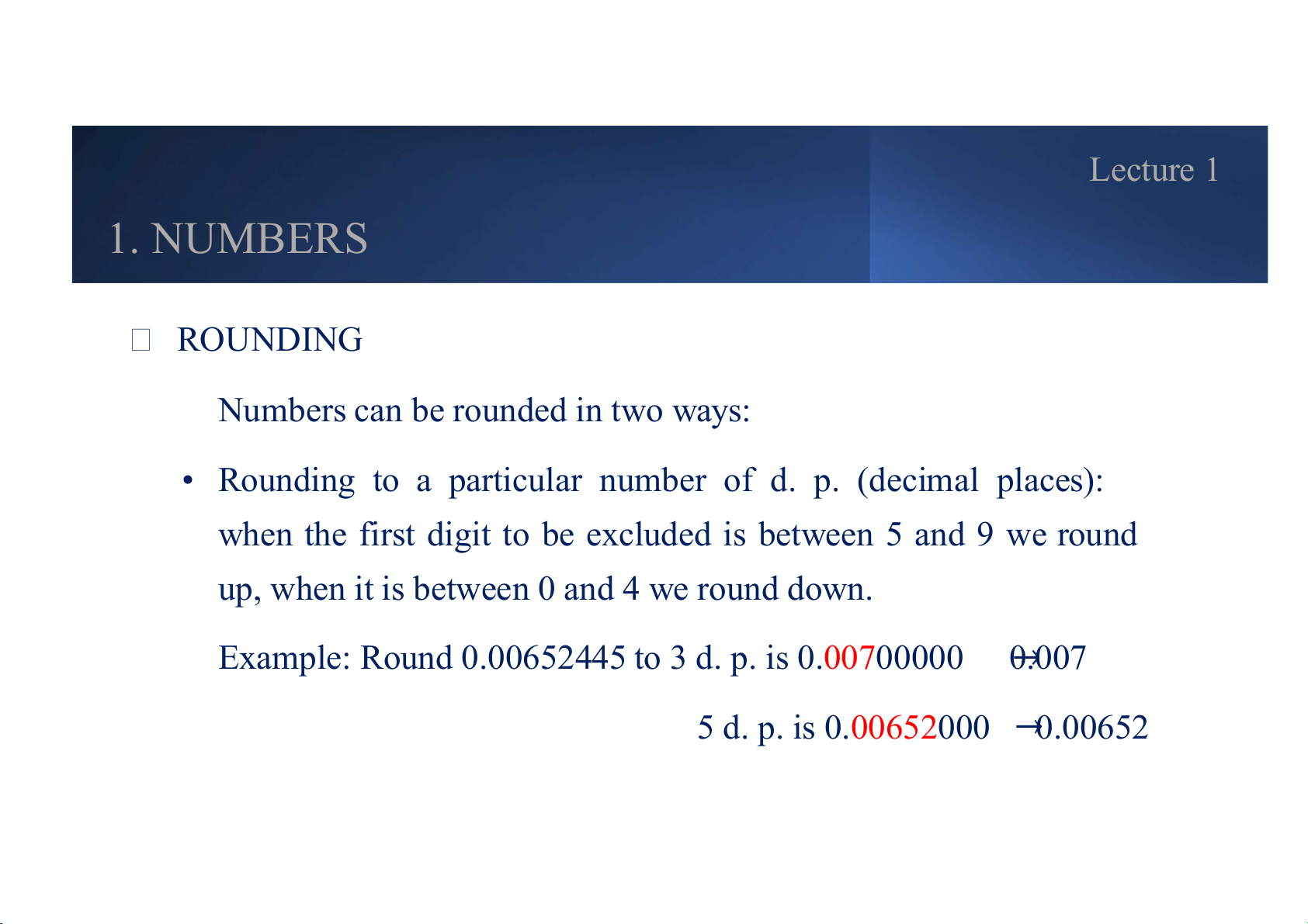 Example: Round 0.00652445 to 3 d. p. is 0.00700000 0.007 5 d. p. is 0.00652000 0.00652 Lecture 1 1. NUMBERS ROUNDING