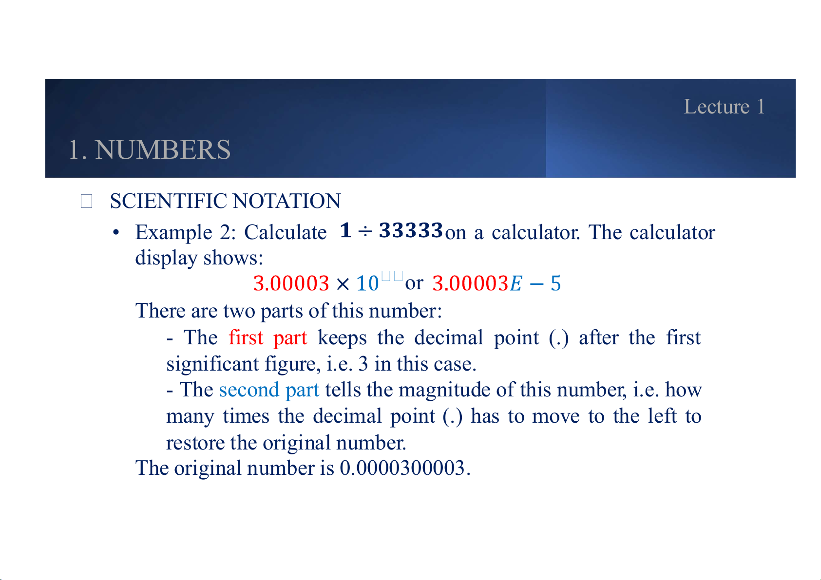 The original number is 152,345,677,600. Lecture 1 1. NUMBERS SCIENTIFIC NOTATION • Example 2: Calculate