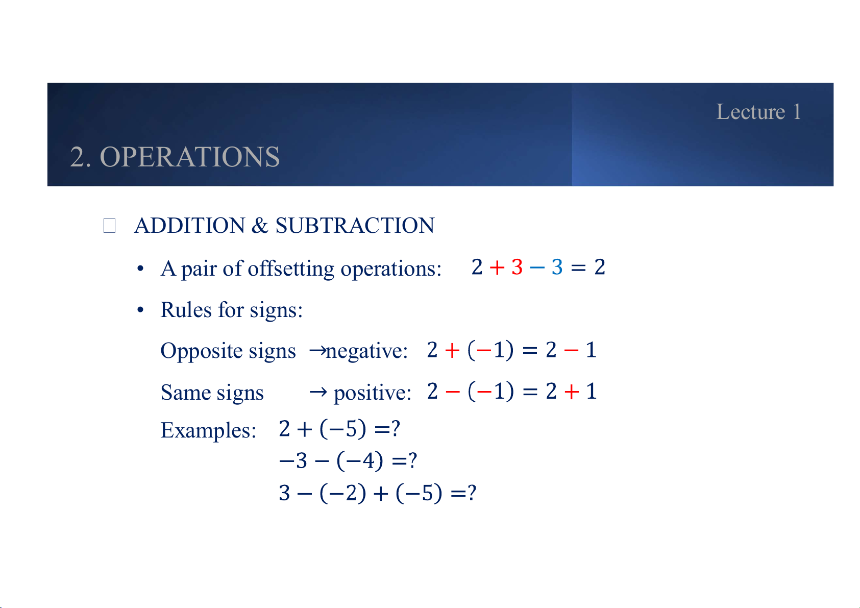 • A pair of offsetting operations: • Rules for signs: Opposite signs negative: Same signs positive: Examples: Lecture 1 2. OPERATIONS ADDITION & SUBTRACTION • Rules for fractions: