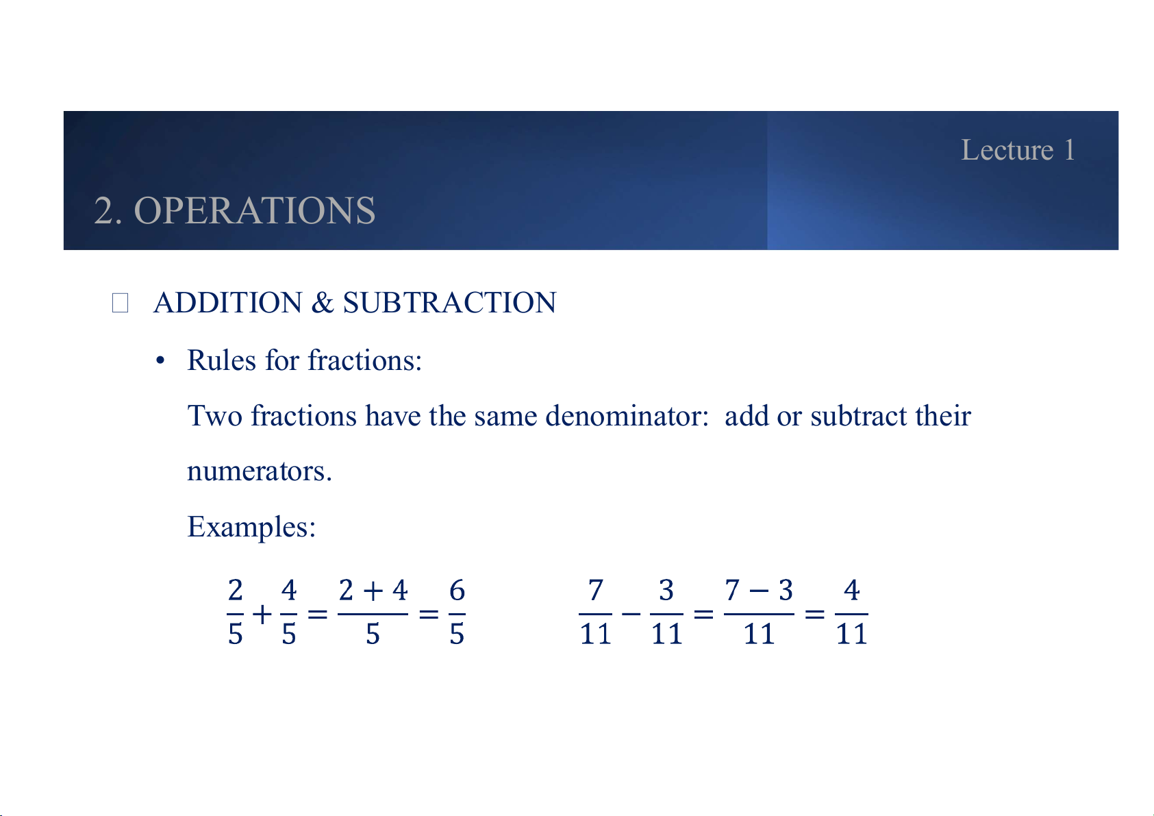 Two fractions have the same denominator: add or subtract their numerators. Examples: Lecture 1 2. OPERATIONS ADDITION & SUBTRACTION • Rules for fractions: