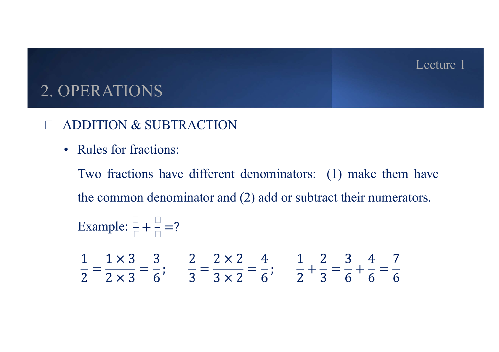 the common denominator and (2) add or subtract their numerators. Example: Lecture 1 2. OPERATIONS ADDITION & SUBTRACTION