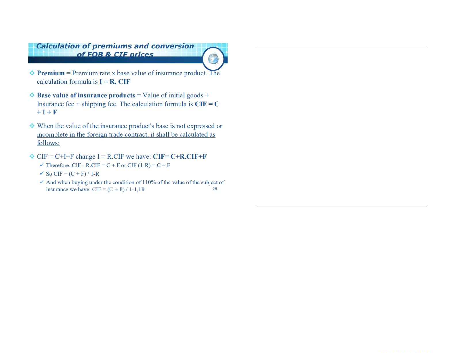 Phí bảo hiểm = lấy tỷ lệ phí (R) nhân giá trị bảo hiểm (thường là CIF). CIF = C + I + F: Giá CIF luôn gồm: ● C = Cost (giá hàng)