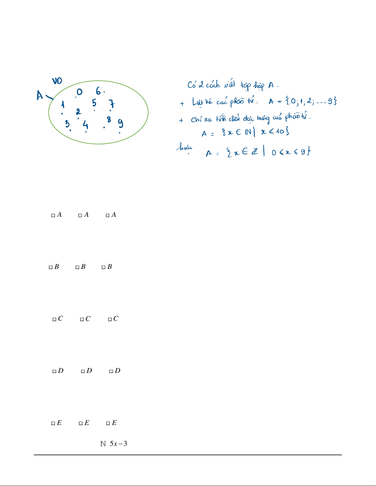 Cho tập hợp F = {x ∣ 5x − 3 =17}.