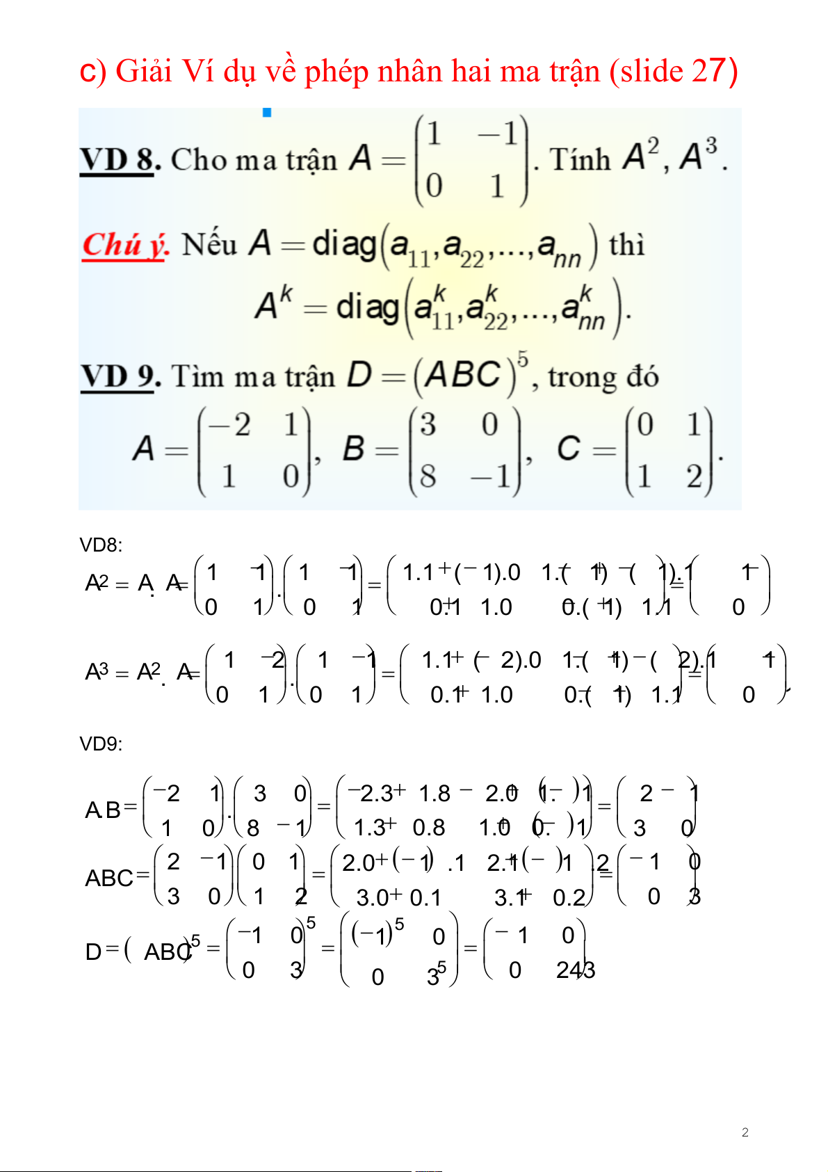 c) Giải Ví dụ về phép nhân hai ma trận (slide 27) VD8: − − + − − + − − 2 1 1 1 1 1.1 ( 1).0 1.( 1) ( 1).1 1 A = . A A= . = = 0 1 0 1 0.1 + 1.0 0. − ( 1 + ) 1.1 0 − − + − − + − − 3 2 1 2 1 1 1.1 ( 2).0 1.( 1) ( 2).1 1 A = A . A= . = = 0 1 0 1 0.1+ 1.0 0.( − 1) + 1.1 0 1 VD9: −2 1 3 0 2