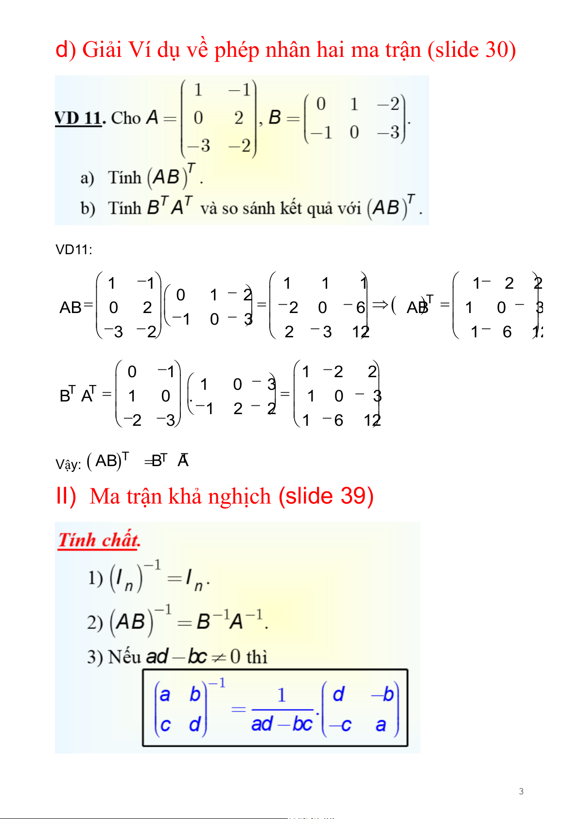 d) Giải Ví dụ về phép nhân hai ma trận (slide 30) VD11: 1 1 − 1 1 1 1− 2 2 0 1 − 2 = 0 2 = − 2 0 − 6 ( )T AB AB = 1 0 − 3 1 0 3 − − −3 −2 2 − 3 12 1 − 6 12 0 1 − 1 −2 2 1 0 − 3 T T B A = 1 0 . = 1 0 − 3 − 1 2 − 2 2 − −3 1 − 6 12 Vậy: ( )T T T AB B = A