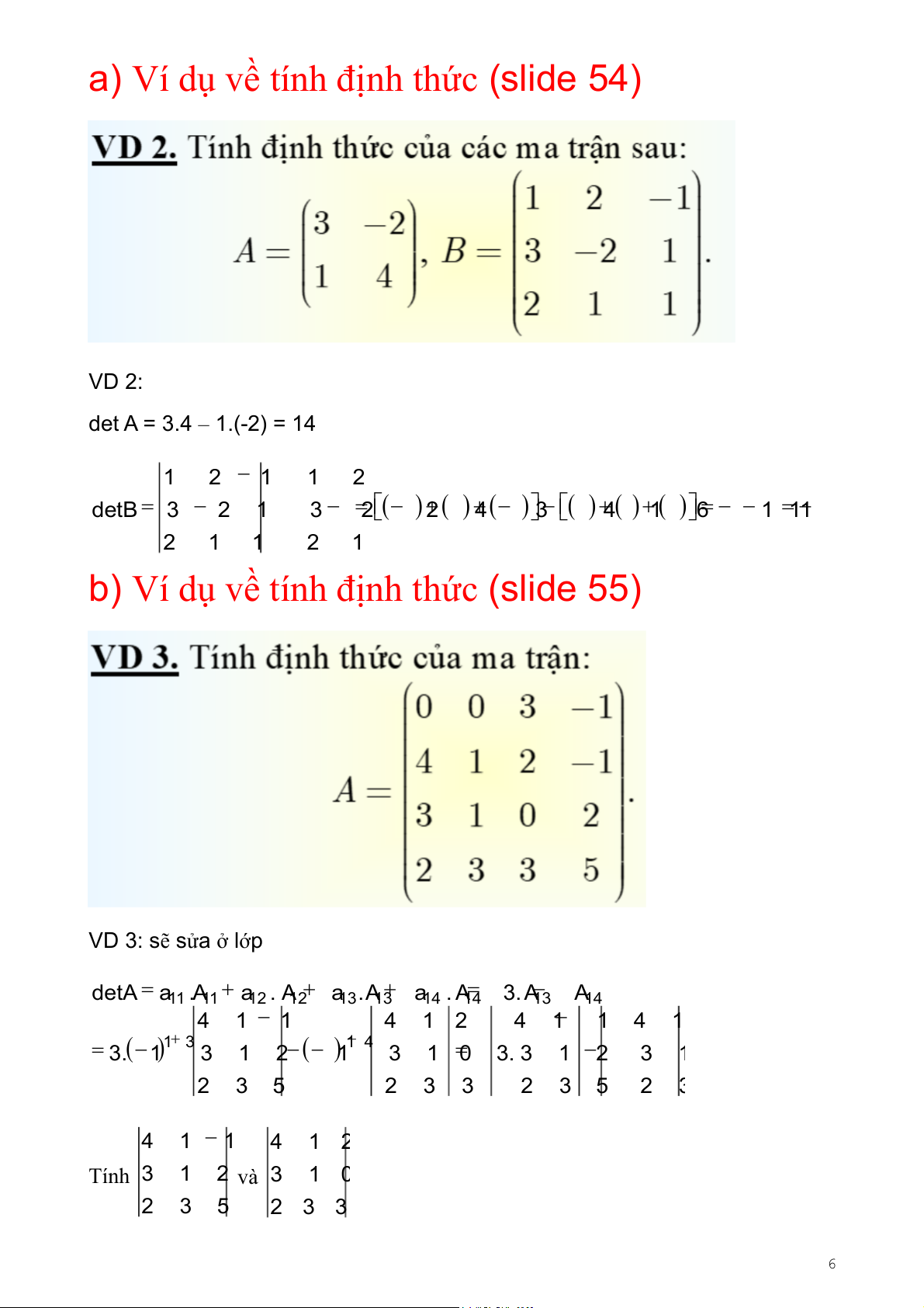 a) Ví dụ về tính định thức (slide 54) VD 2: det A = 3.4 – 1.(-2) = 14 1 2 − 1 1 2 detB = 3 − 2 1 3 − 2 = ( − ) 2+( ) 4+(− ) 3 − ( )+ ( 4 ) + ( 1 ) 6 = − − 1 1 = 1− 2 1 1 2 1