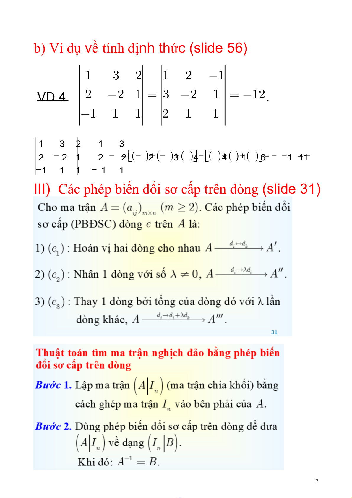b) Ví dụ về tính định thức (slide 55) VD 3: sẽ sửa ở lớp detA = + + + = − 1 a 1 . 1 A1 1 a 2 . 1 A2 1 a 3. 1 A 3 1 a 4 . 1 A4 3. 1 A 3 1 A 4 4 1 − 1 4 1 2 4 1− 1 4 1 + + = 3 (.− )1 3 1 3 1 2− (− ) 1 4 1 3 1 0 = 3. 3 1 2 − 3 1 2 3 5 2 3 3 2 3 5 2 3 4 1 − 1 4 1 2 Tính 3 1 2 và 3 1 0 2 3 5 2 3 3 6 b) Ví dụ về tính đị nh thức (slide 56) 1 3 2 1 2 1 VD 4. 2 2 1 3 2 1 12. 1 1 1 2 1 1 1 3 2 1 3 2 − 2 1 2 − 2 = ( − )2+ (− )3+ ( )4−