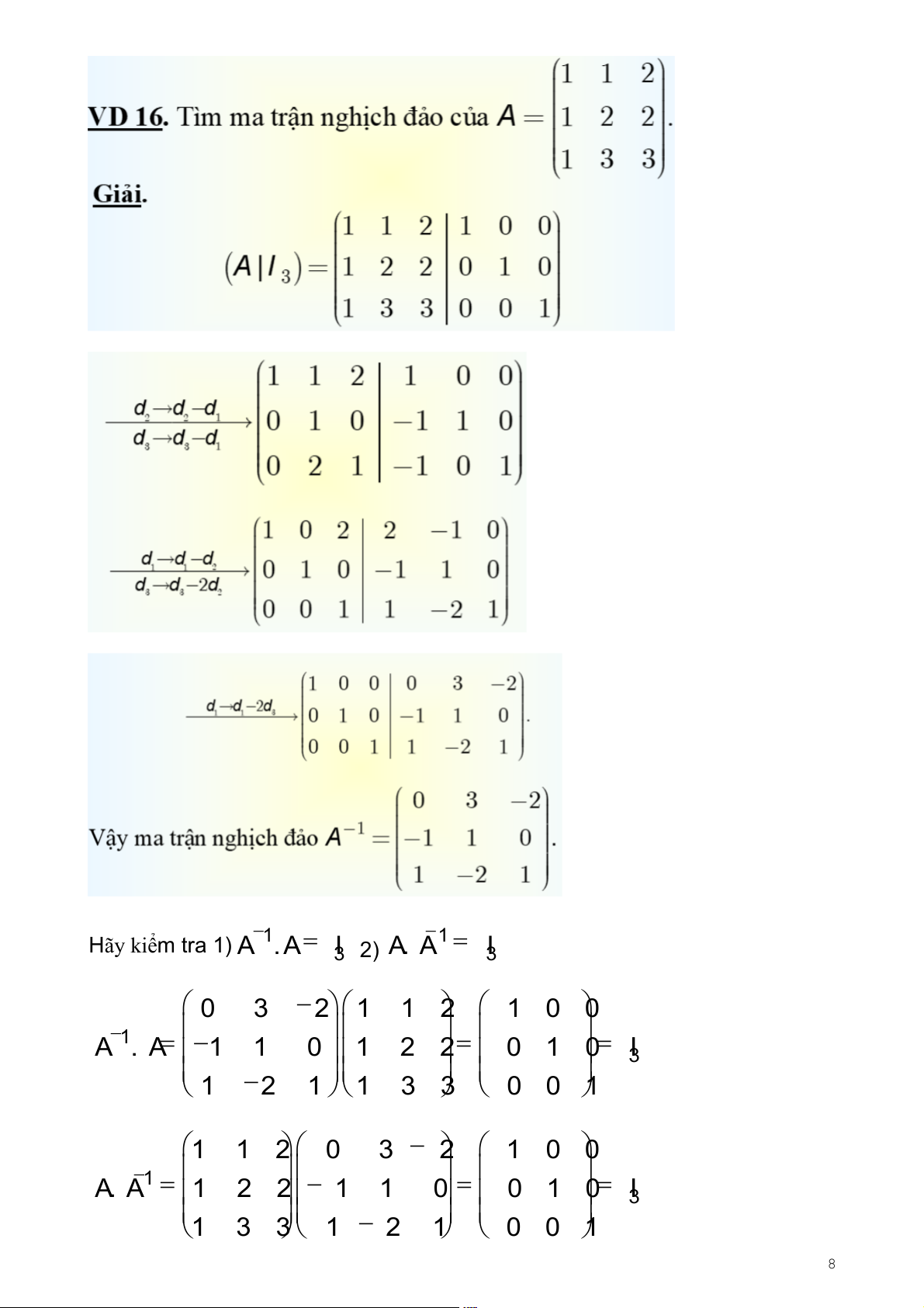 b) Ví dụ về ma trận khả nghịch (slide 43) VD15: 5 −3 − − − A= , 5 ( . − ) 2− ( 3.− ) 1 1 2 3 2 3 3= − 1 A = = 3 −2 −1 − 3 5 3 − 5 = 1 − − = 1 − − − − − = 1 2 3 4 1 2 7 AX B A AX A B X A B = =